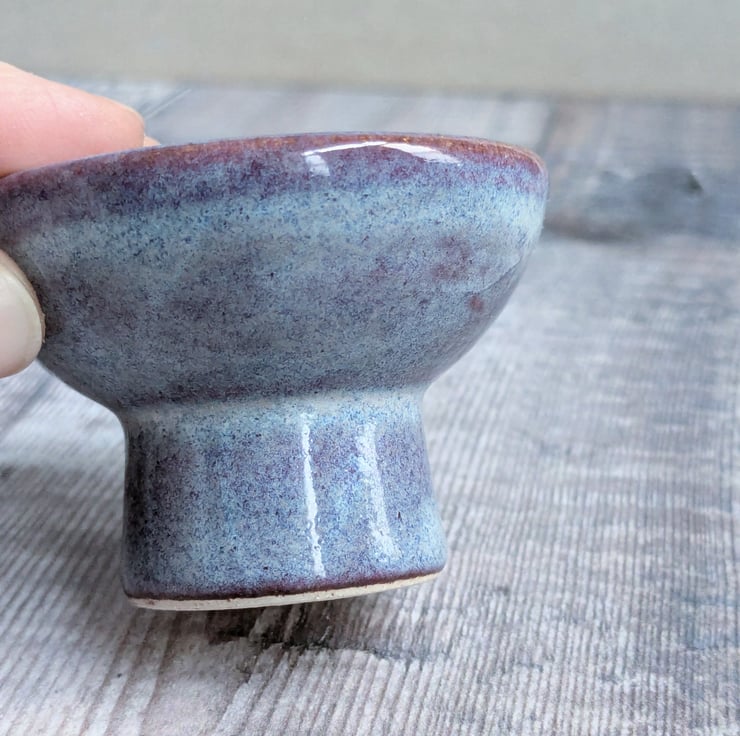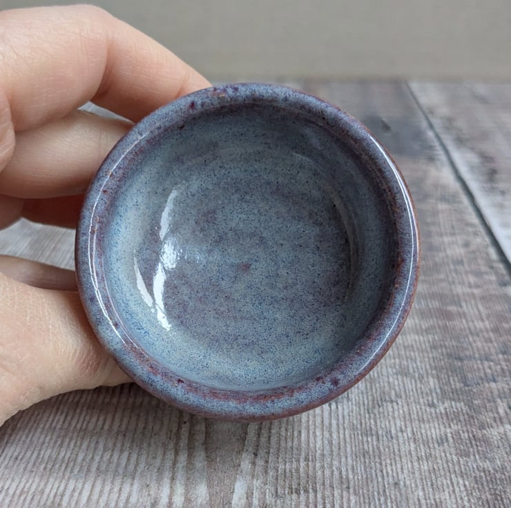A small ring dish on a raised base, wheel thrown in a white stoneware clay. The glaze is a soft muted light purple. It measures about 4cm high, the diameter is about 5cm.