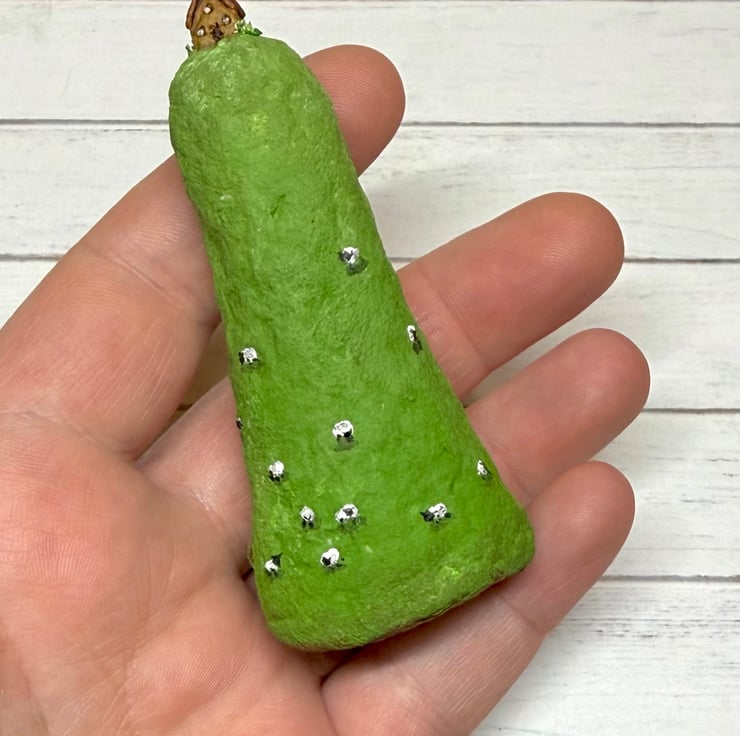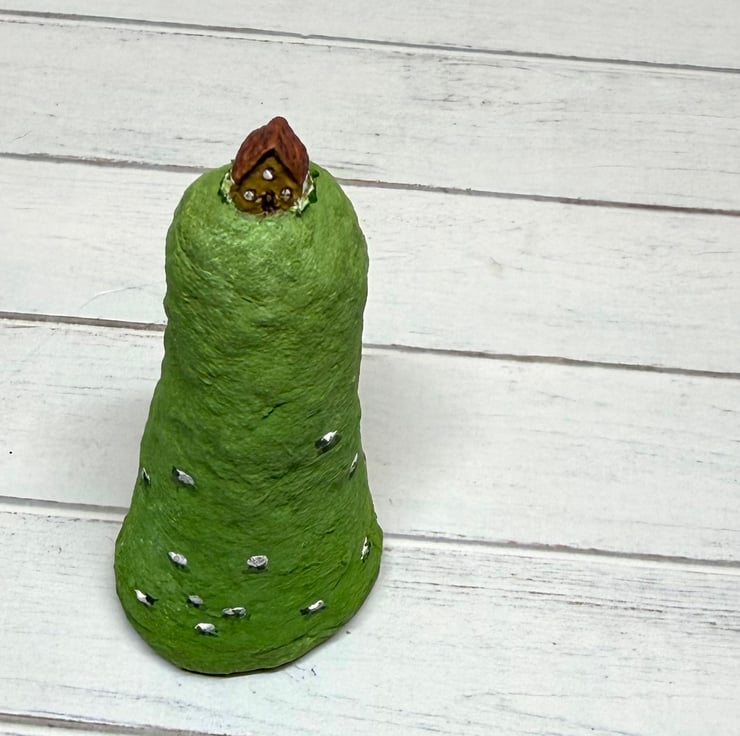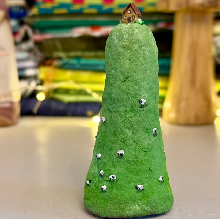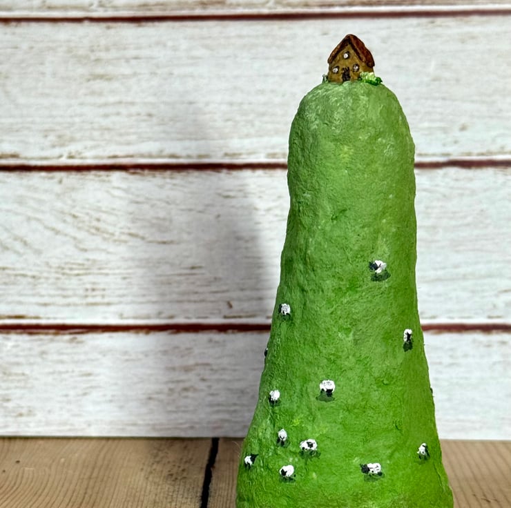 A tiny house sits atop a Welsh hill dotted with sheep. This hill and house is completely hand painted, with tiny details including grazing sheep. Hill made from spun cotton and house made from clay. Measures roughly 8cm tall and stands unaided. This is for decorative purposes only and not a toy. Gift wrapped and sent in recyclable or recycled packaging.