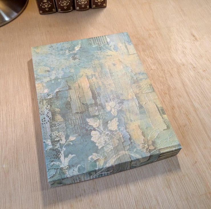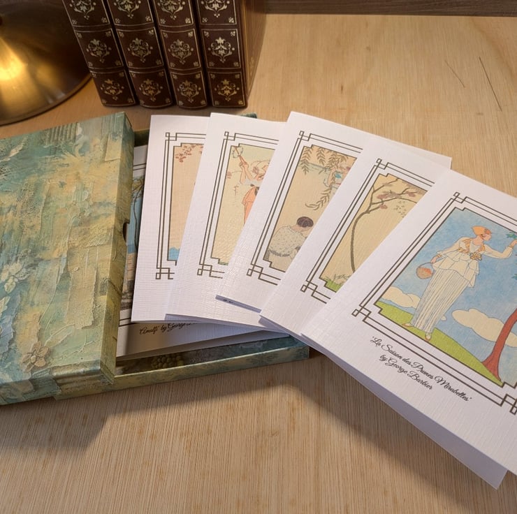 A handmade, boxed Set of 6 notecards featuring Art Deco fashion illustrations by George Barbier which were published between 1914 and 1922 in the lifestyle magazines 'Gazette du Bon Ton' and 'Modes and Manieres d'Aujourd'hui'. The linen effect cards are left blank for your own message and are supplied with envelopes in a handmade presentation box with separate lid. The box and lid are covered in a green, bohemian design paper which completely covers both the box and lid with no cardboard showing.