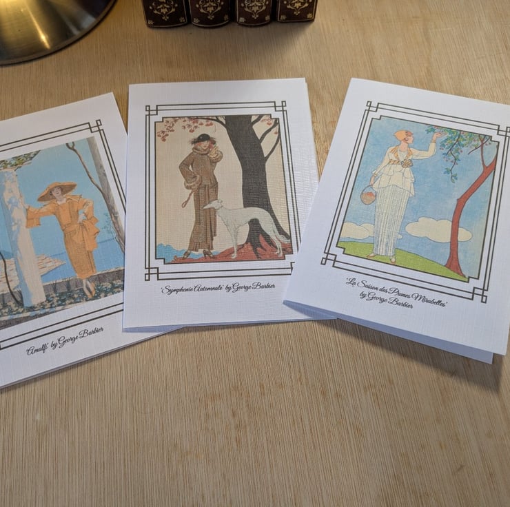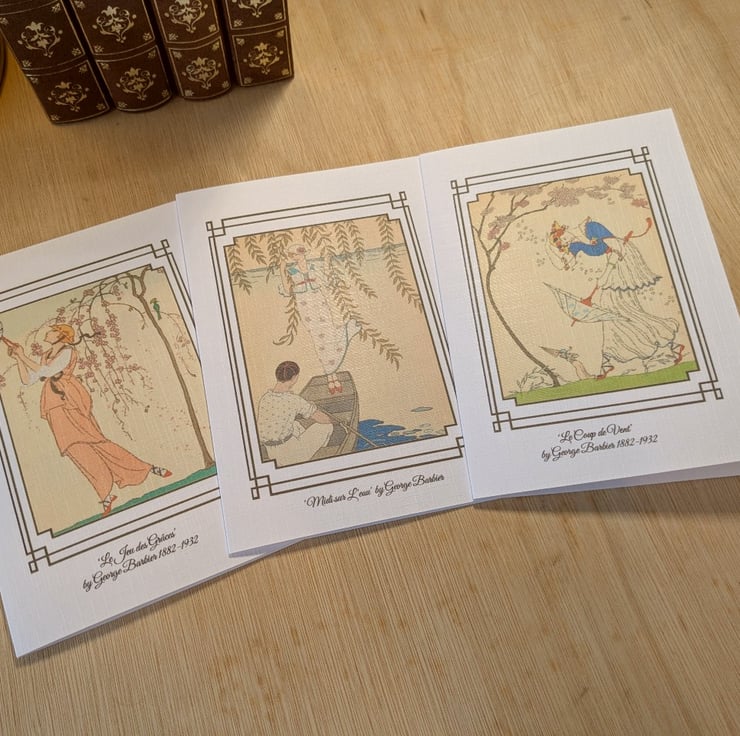 These cards feature fashion illustrations by George Barbier. George Barbier was born 1882 in Nantes, France and was 29 years old before he mounted his first exhibition. He subsequently became one of the greatest French illustrators of the early 20th century gaining commissions in theatre design, ballet costumes, and illustrations for books and haute couture fashions. During the 1920’s, Barbier was part of an elite circle from the Ecole des Beaux Arts nicknamed “The Knights Of The Bracelet” by Vogue magazine, largely because of their flamboyant dress and lifestyle. He also designed jewellery, glass and wallpapers, and became a regular contributor to the famous 'Gazette du Bon Ton' and ‘L'Illustration’ magazines.