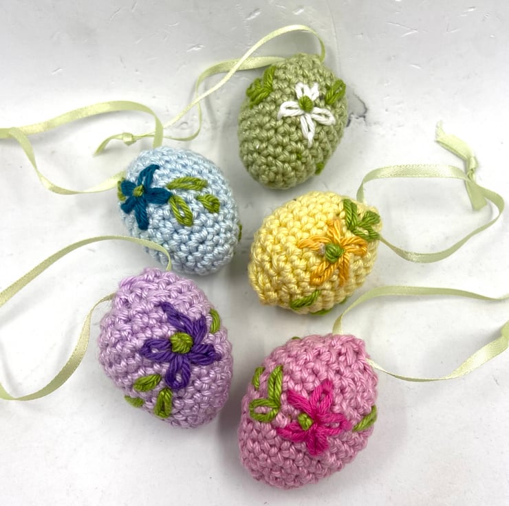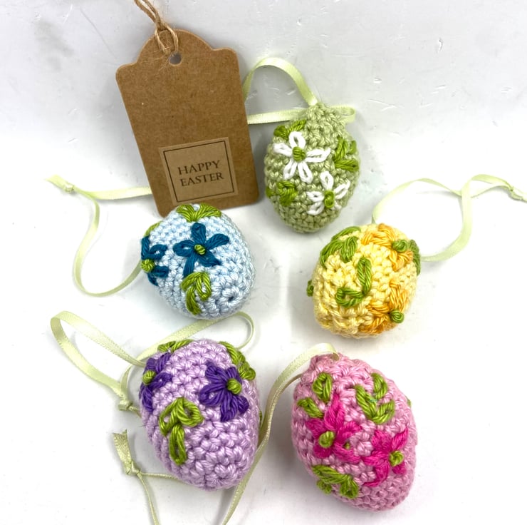 These five pretty eggs are crocheted and embroidered in cotton and filled with polyester stuffing. They hang from a pale Green/yellow stain ribbon and come with a tag that reads Happy Easter. Each egg measures approximately 4cm in height. They are perfect for decorating an Easter branch and would make a lovely alternative gift to a chocolate egg.