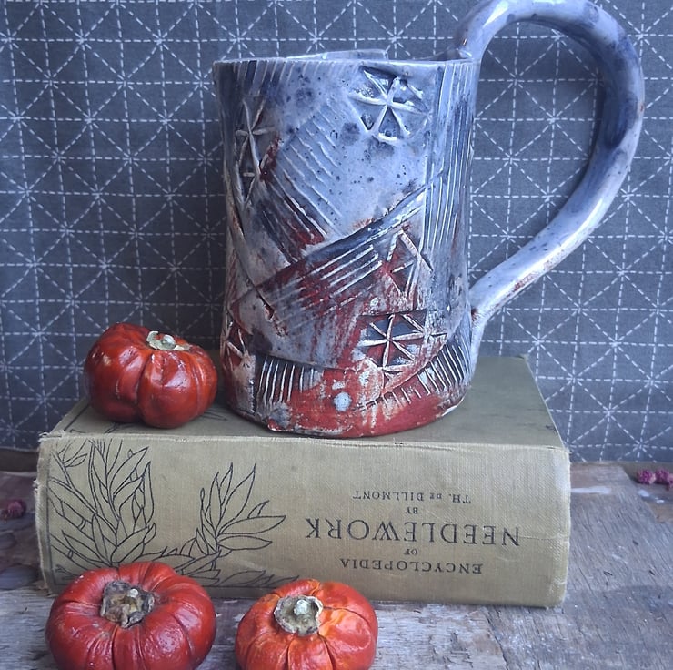 Stoneware mug with a geometric and abstract design and a burnt tomato and grey glaze