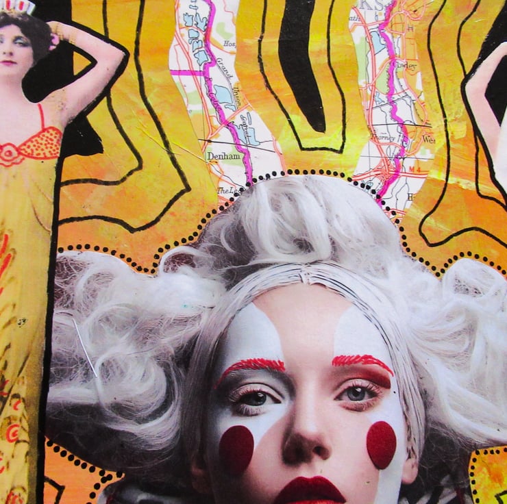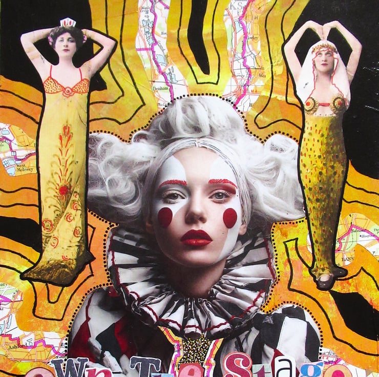 This stunning mixed media / collage painting blends elements of circus or carnival aesthetics, vintage imagery, and bright, symbolic patterns, with the central female styled like a harlequin or Pierrot clown, with pale face, exaggerated makeup and a dramatic collar. This figure commands attention and represents performance, or emotional intensity. The background map elements suggest themes of exploration, destiny, or the interconnectedness of places and lives. Two further theatrical vintage dressed women stand symmetrically on either side, almost like totems, muses, or guardians. The butterflies and plants towards the bottom soften the scene, evoking transformation, rebirth, and natural cycles.