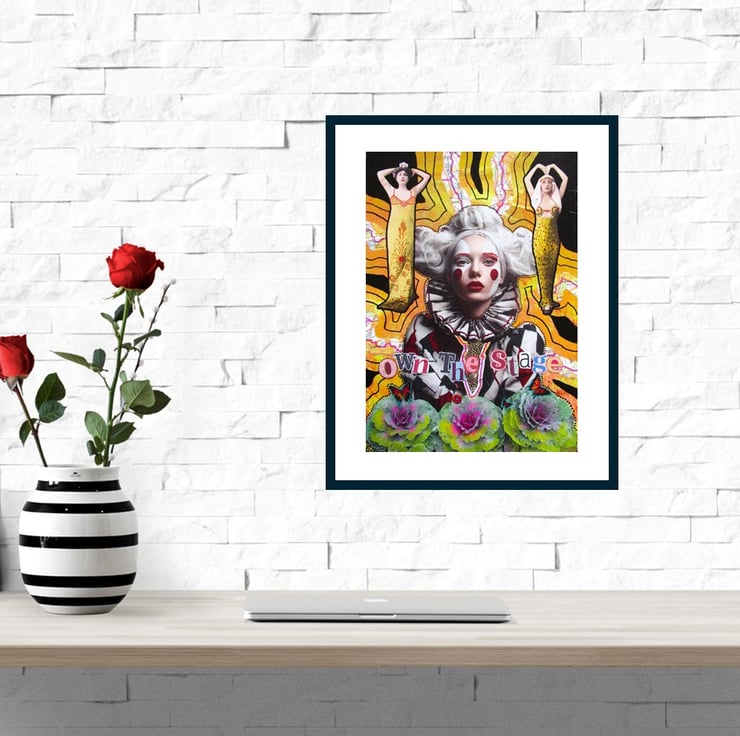 In acrylic, collage and drawing pens, this unique artwork measures 10 x 14 inches so perfect to slip straight into any standard sized frame (or mount). Overall, this artwork feels like a vibrant meditation on identity, performance, or metamorphosis; a theatrical self-portrait or commentary on the act of presenting oneself to the world. It would be perfect for lovers of maximalist décor, psychedelic or surreal art, and unique or avant-garde conversation pieces. It will be hand signed on the front by Bea before shipping.
