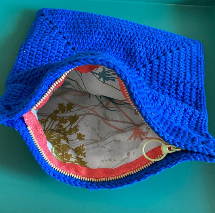 I bought the lining fabric from local designer Clarissa Hulse in the autumn and wanted to make something nice with it. The vibrant colours of the yarn complement the fabric really well I think, and the colourful zips go nicely with it too. I made several different designs, see my other listings!