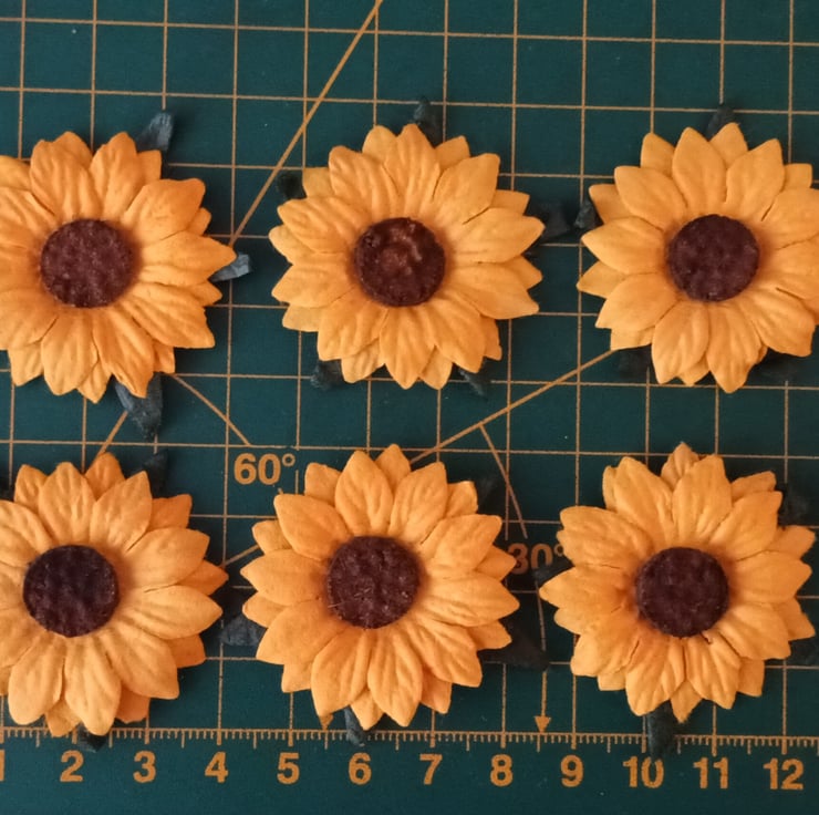 A pack of 6 large mulberry paper Sunflowers. Ideal for card making, decorating boxes or hair accessories etc. Size is provided in the last photo, approx. 4cms.