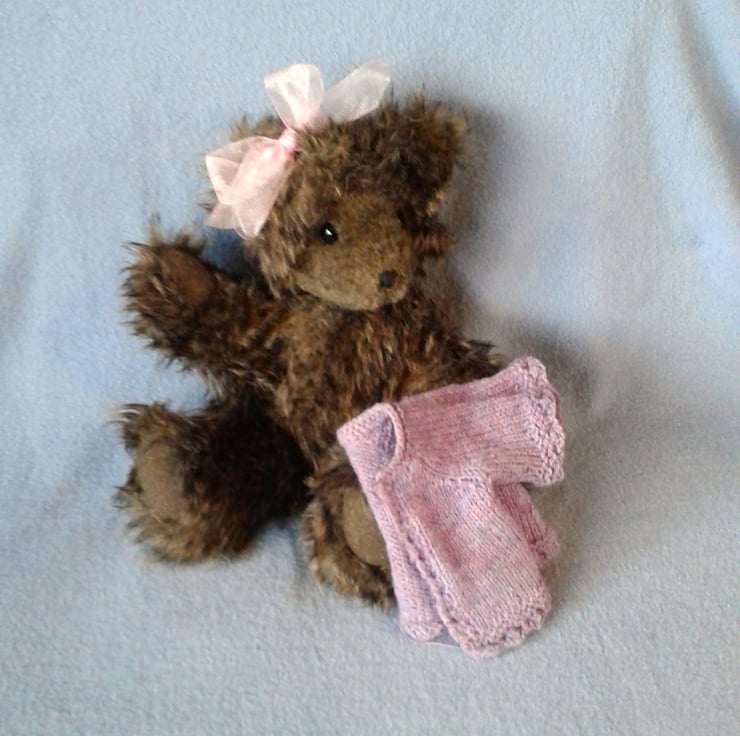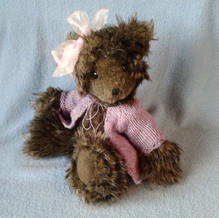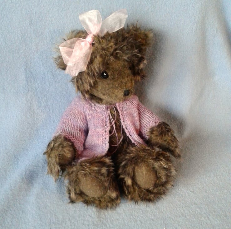 Tiggy has a cute little ear bow which can be removed to restyle and I have knitted her a cardigan in flecked purple heather wool.
