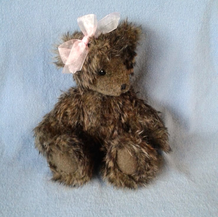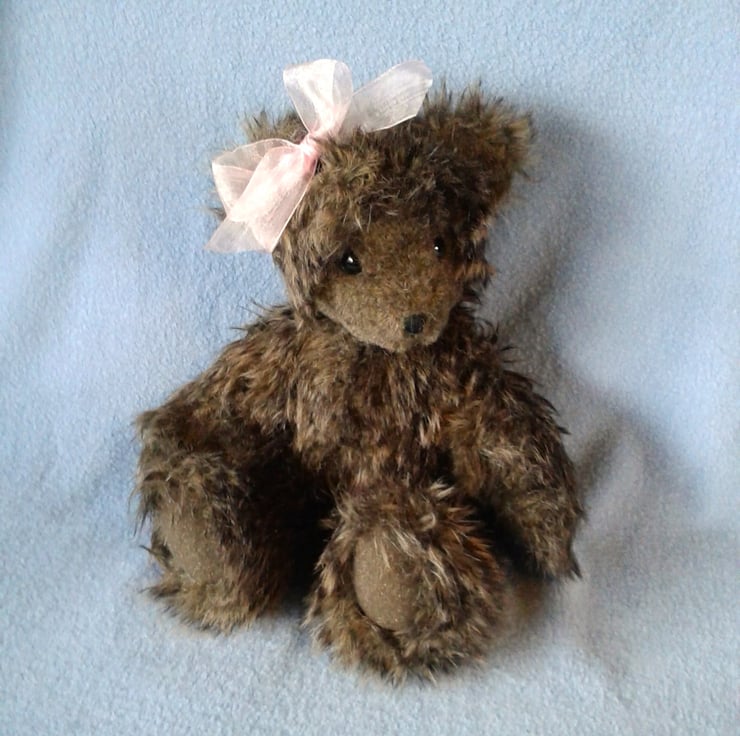 I love to repurpose fabrics which can be a challenge creating a pattern to fit the fabric. Tiggy is cut from a beautiful but sadly unwanted faux fur collar and there will never be another bear the same because of this. I have used felted wool fabric from a jumper for her paw pads and this complements her fur beautifully.