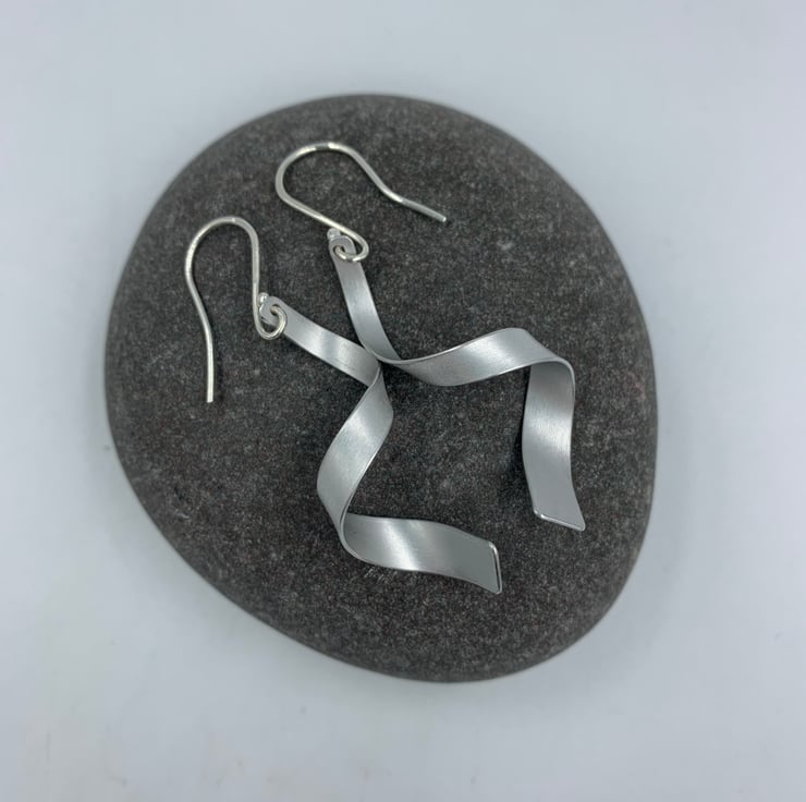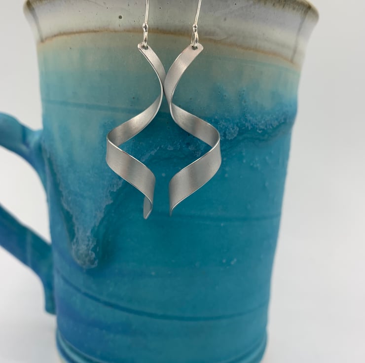 These statement earrings were created by me from scratch using un-dyed anodised aluminium. I cut the metal into a tapered shape before carefully forming it into a spiral that gradually opens out to be wider at one end.