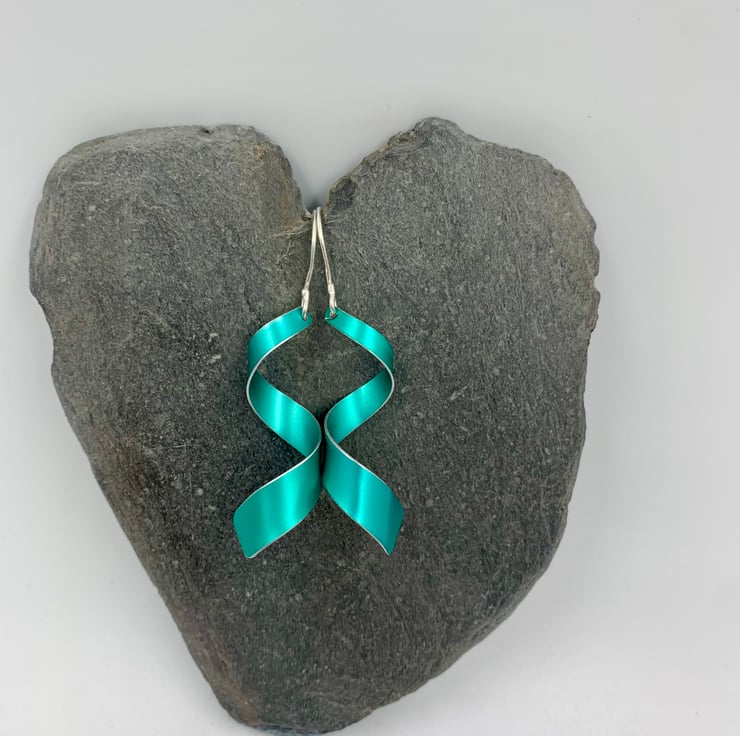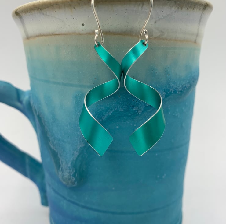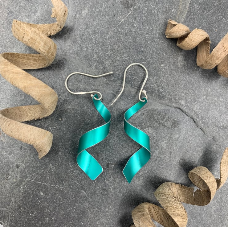 These statement earrings were created by me from scratch using hand dyed anodised aluminium. I cut the metal into a tapered shape before carefully forming it into a spiral that gradually opens out to be wider at one end.