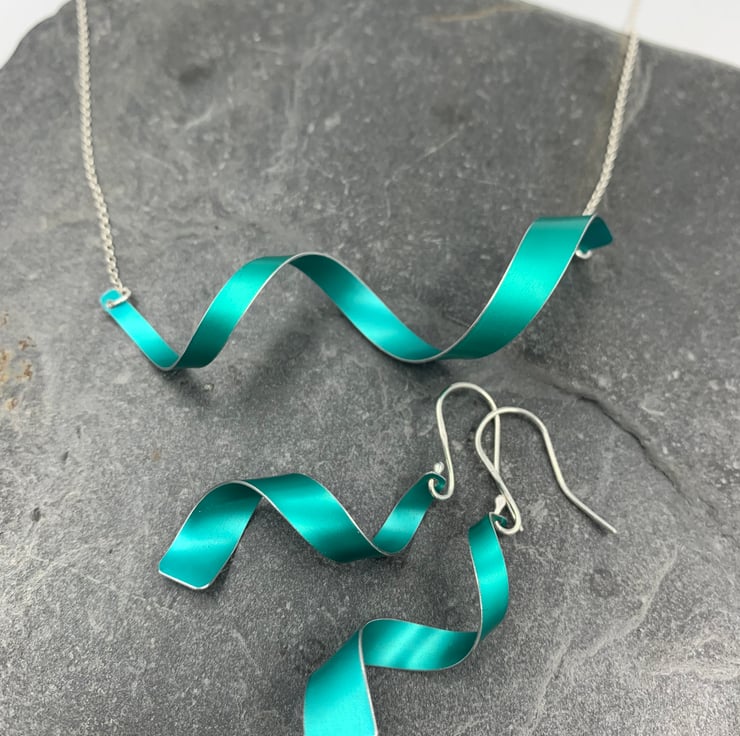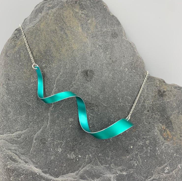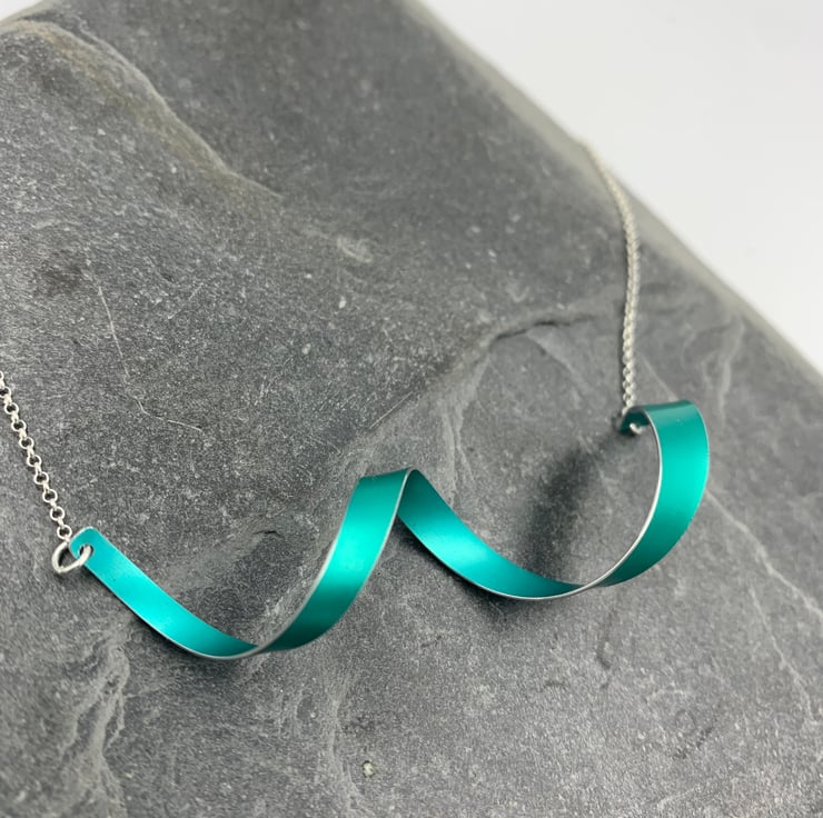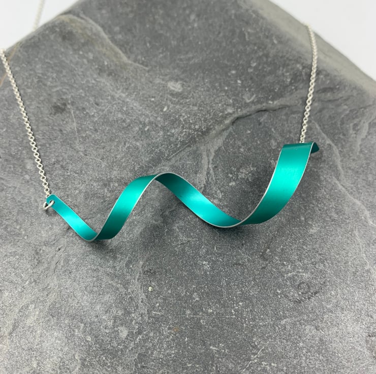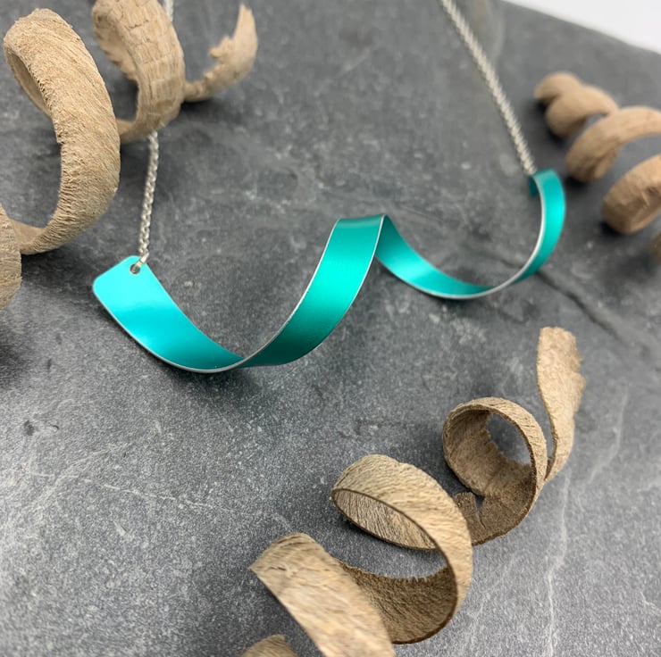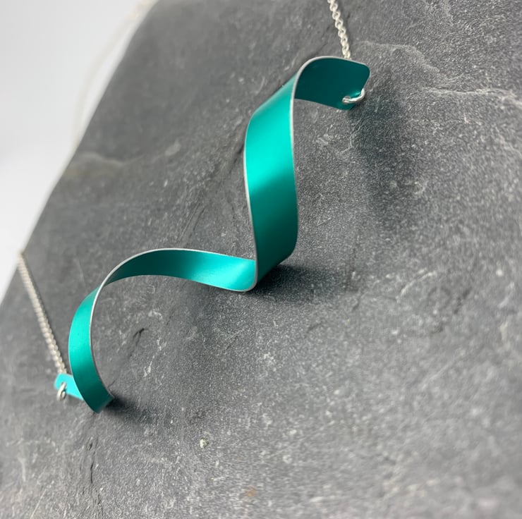 This statement pendant was created by me from scratch using hand dyed anodised aluminium in a stunning teal.. I cut the metal into a tapered shape before carefully forming it into a spiral that gradually opens out to be wider at one end.