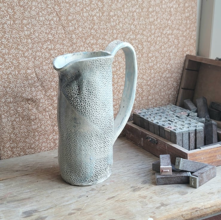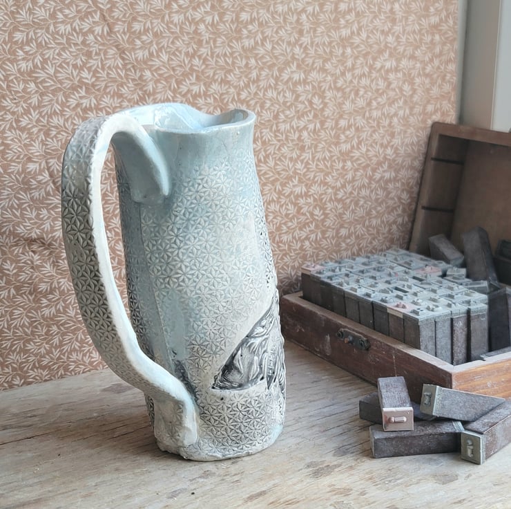 Stoneware jug with a pale blue moth Moth design and a bright turquoise glaze