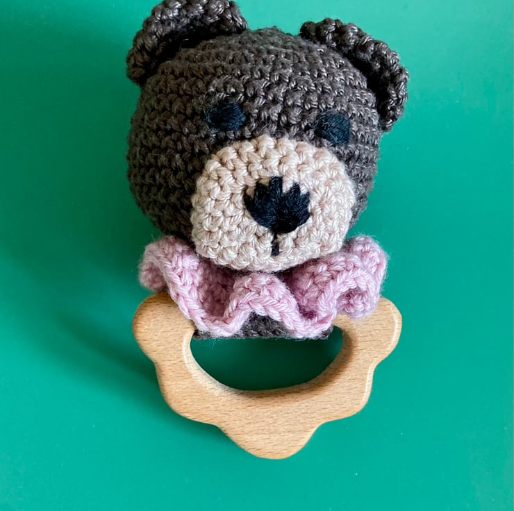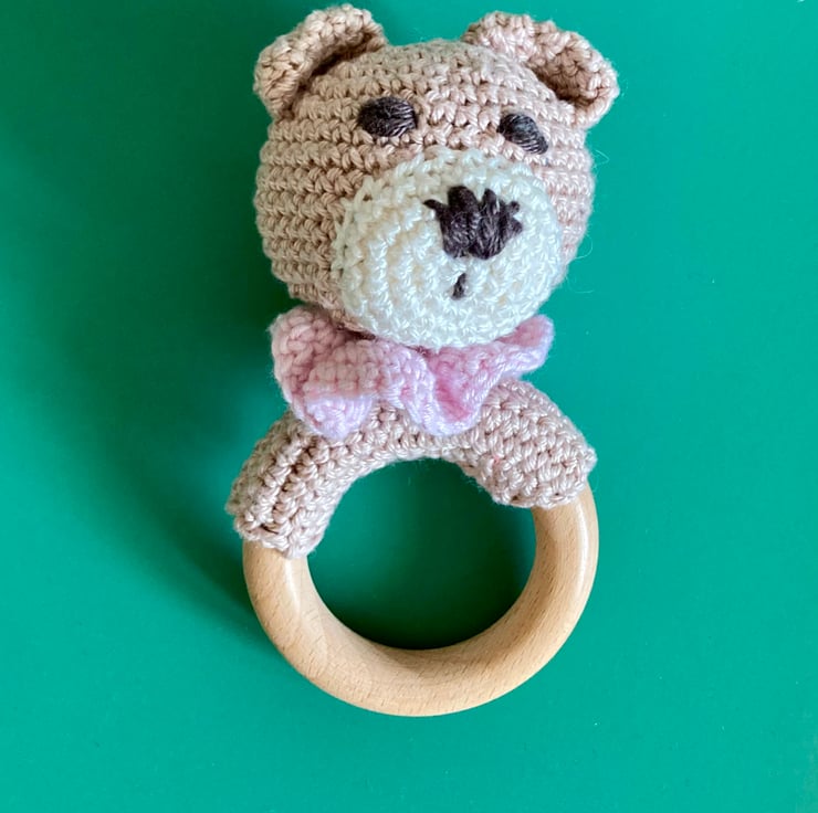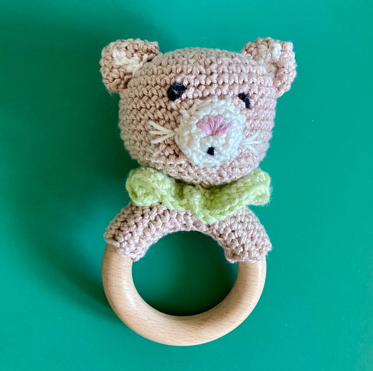 Teething toys are made with pure cotton yarn, with bamboo filling. All materials are natural. The wooden ring is made from pure uncoated beechwood. Please specify which animal you would like: white bear, beige bear, brown bear, beige cat, or brown cat.