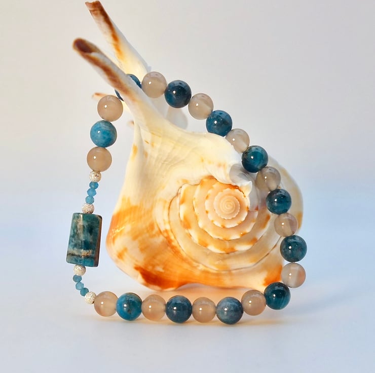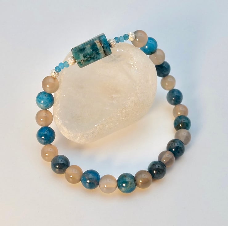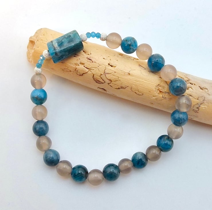 Ocean Blue Apatite and Grey Agate beaded bracelet with a central barrel shaped Apatite stone highlighted with tiny faceted Apatite and sparkly sterling silver stardust beads.