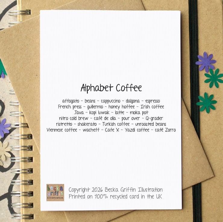A beautiful greetings card featuring a coffee - or related item - for each letter of the alphabet.