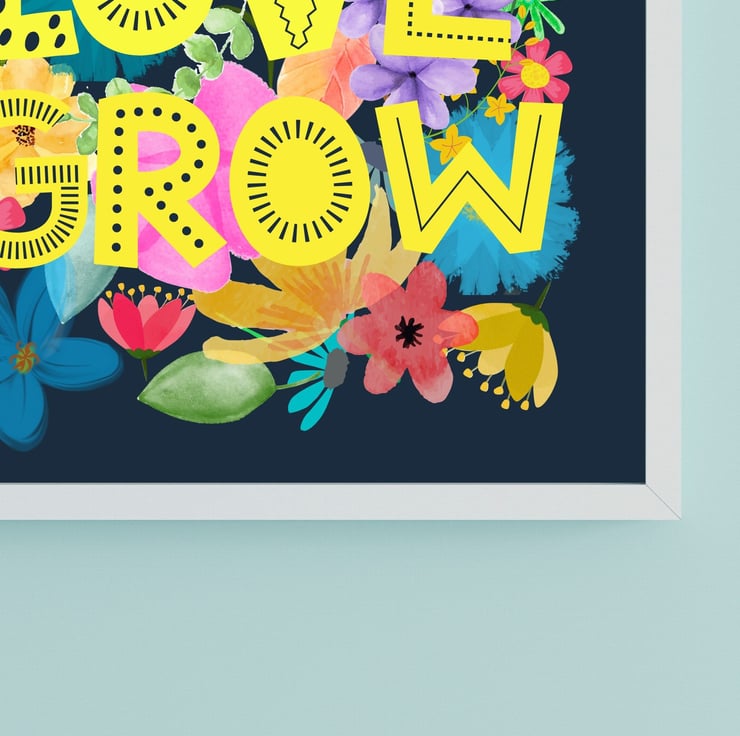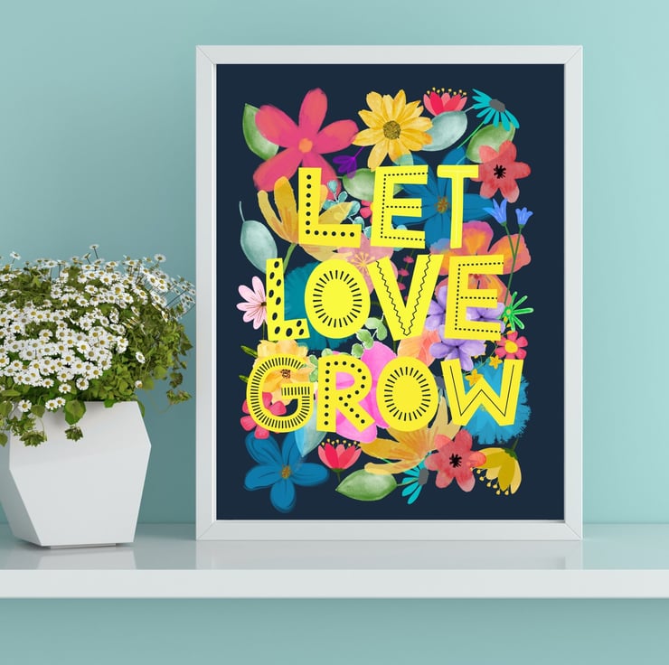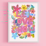 Designed exclusively by Mabel & Me, this print features watercolour flowers with bold 'Let Love Grow' lettering.