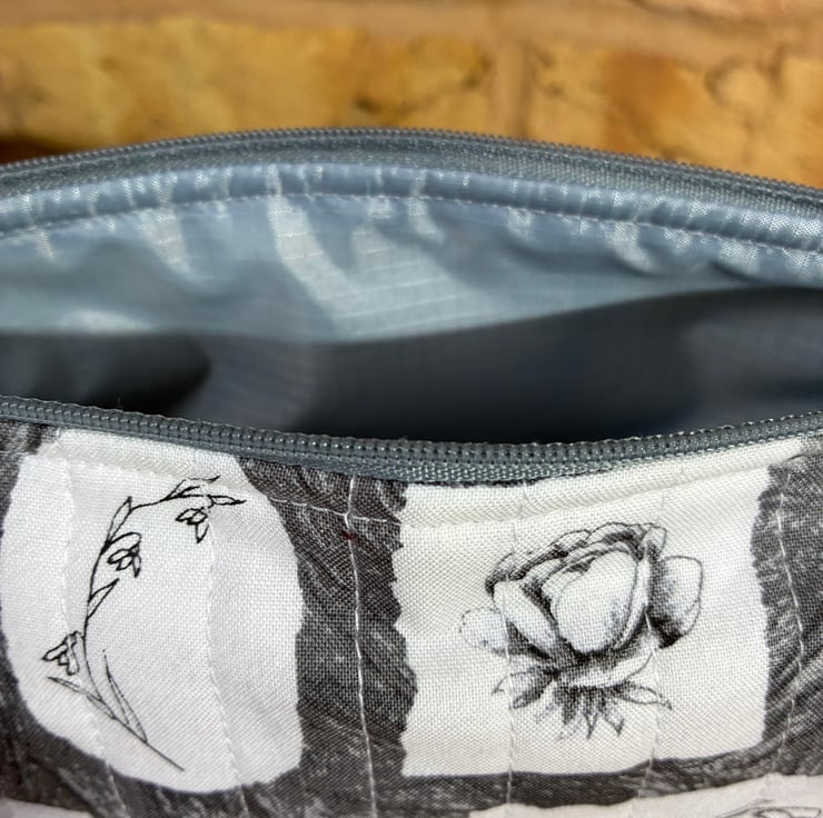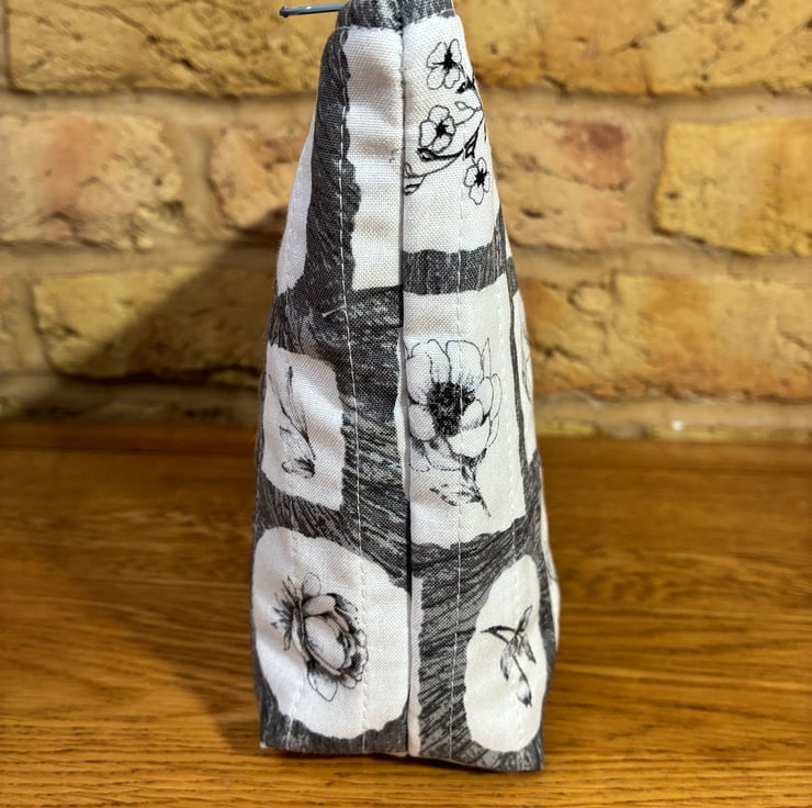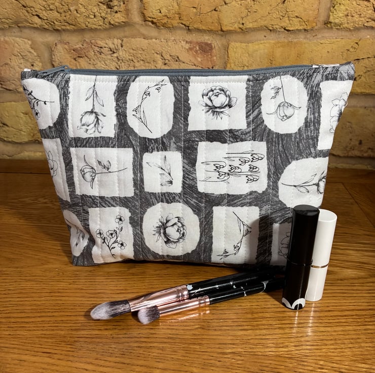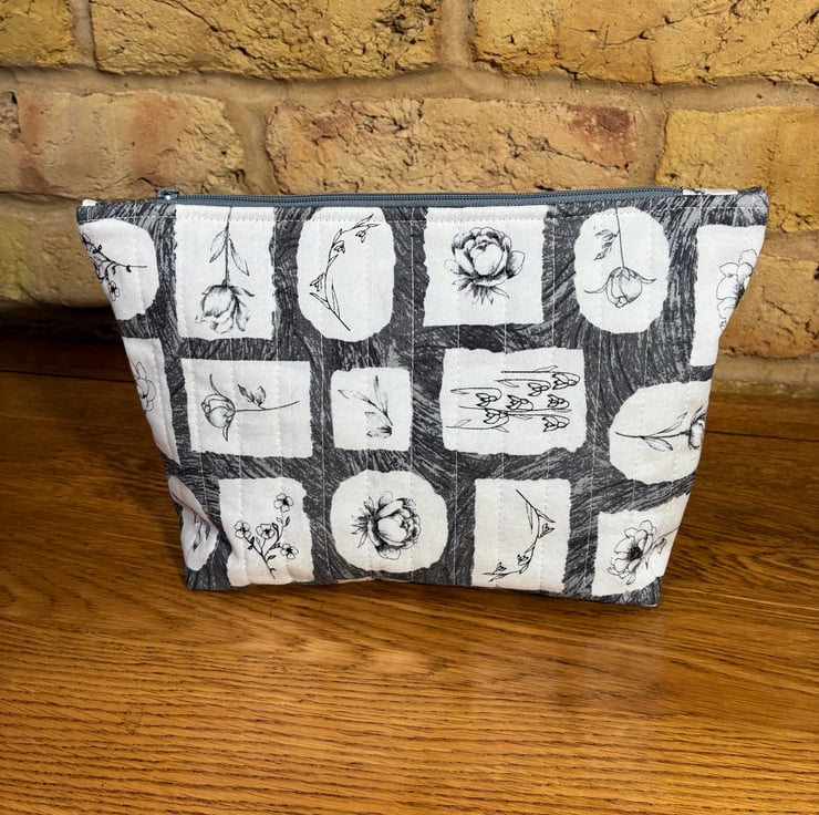 The quilted makeup bag is made from this lovely monochrome flower print fabric.