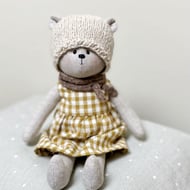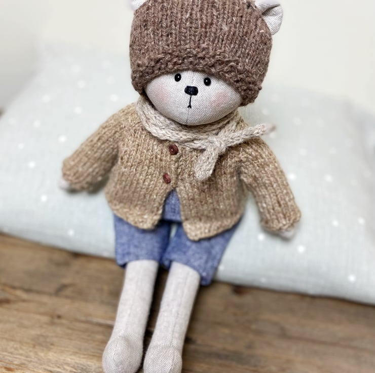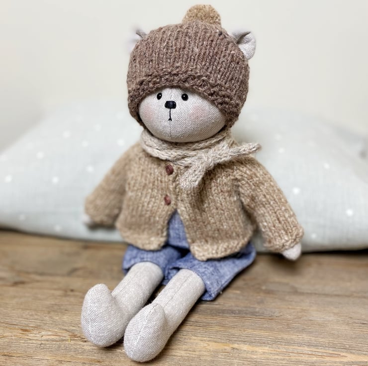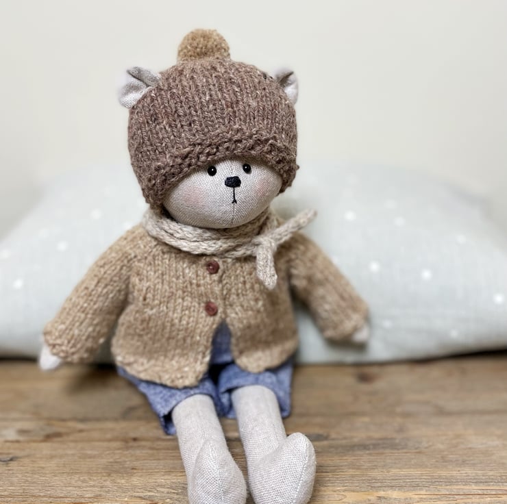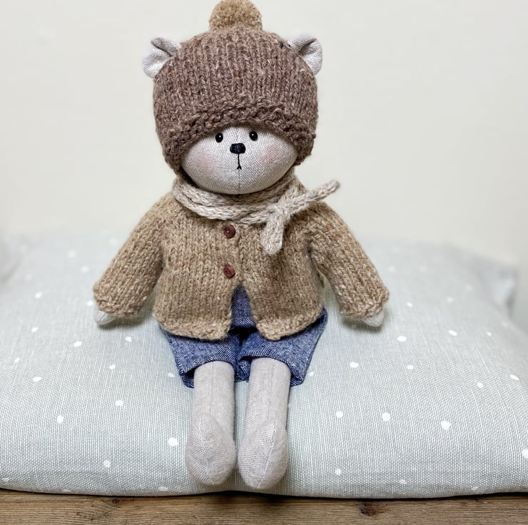 He is 30cms tall and is made from cotton linen blend fabric in a pale neutral shade. His arms and legs are sewn onto his body, he has black glass eyes and is filled with polyester stuffing.