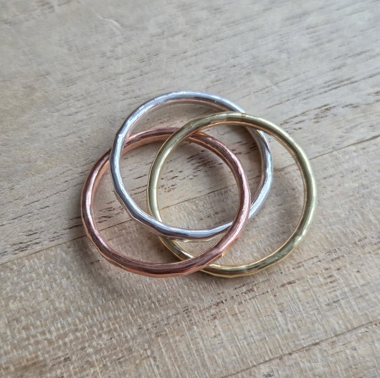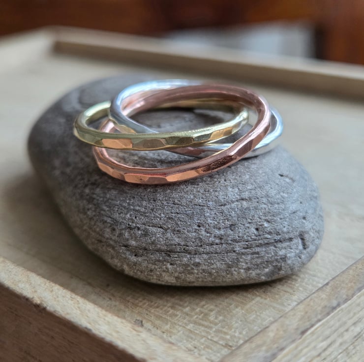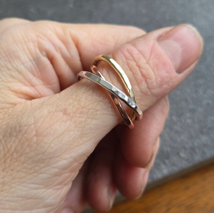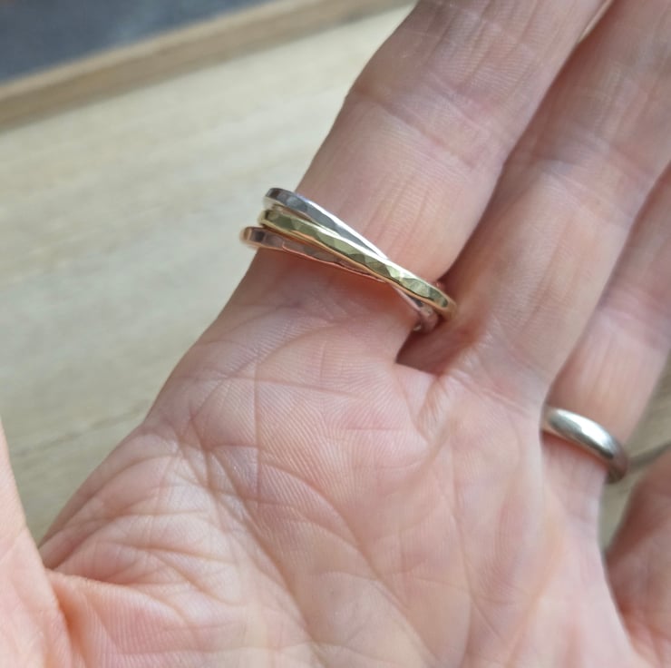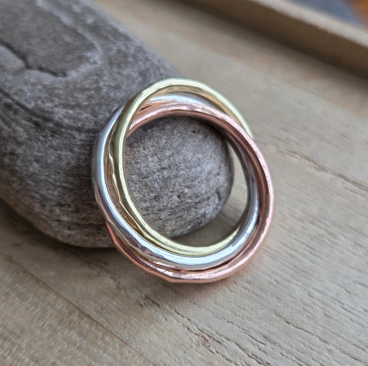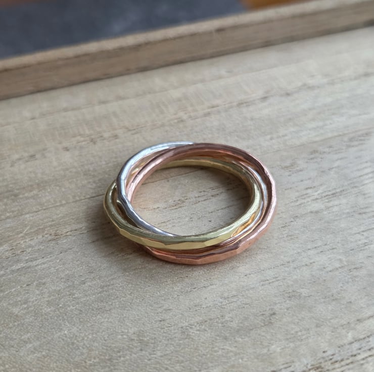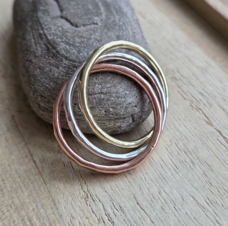 Three slim bands of sterling silver, brass and bronze are linked together in the style of a Russian wedding ring, each band rolls over the other and is perfect as a fidget ring! The bands have a hammer textured finish and are polished to a bright shine.