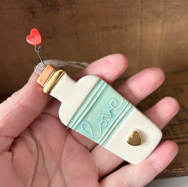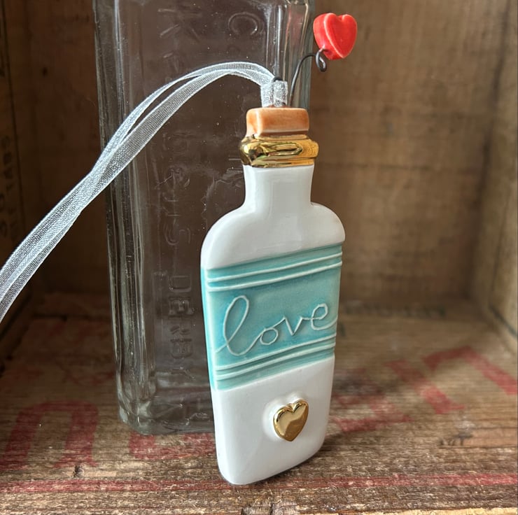 This cute little bottle decoration is made from white earthenware clay. It has been stamped with my own Lino cut Love stamp and glazed. It has then been fired in the electric kiln for a third time to add the opulent gold lustre detailing.