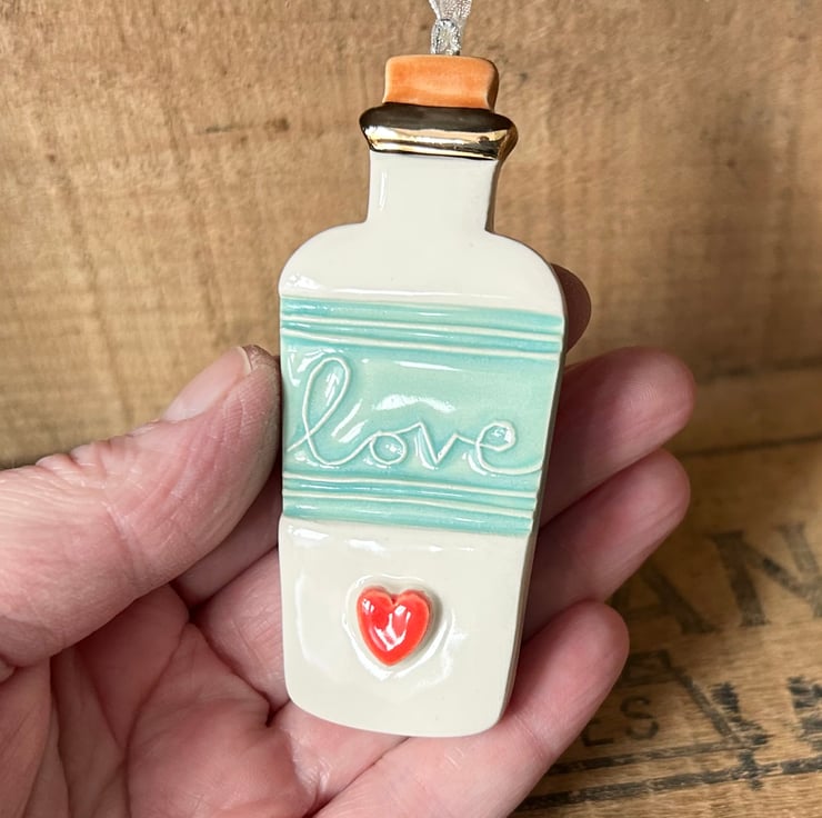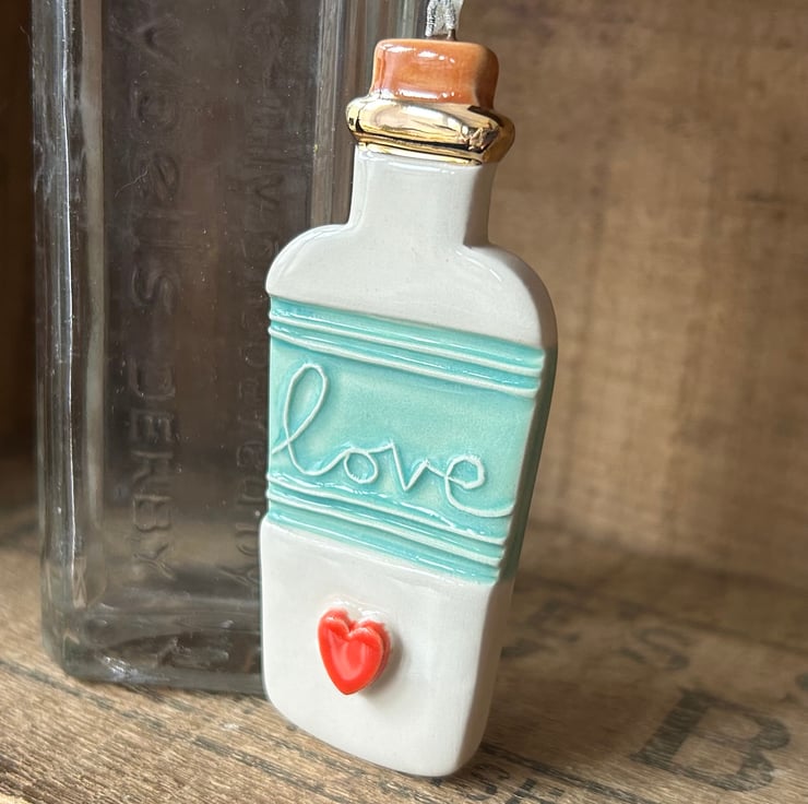 This cute little bottle decoration is made from white earthenware clay. It has been stamped with my own Lino cut Love stamp and glazed. It has then been fired in the electric kiln for a third time to add the opulent gold lustre detailing. Red heart.