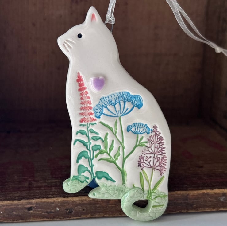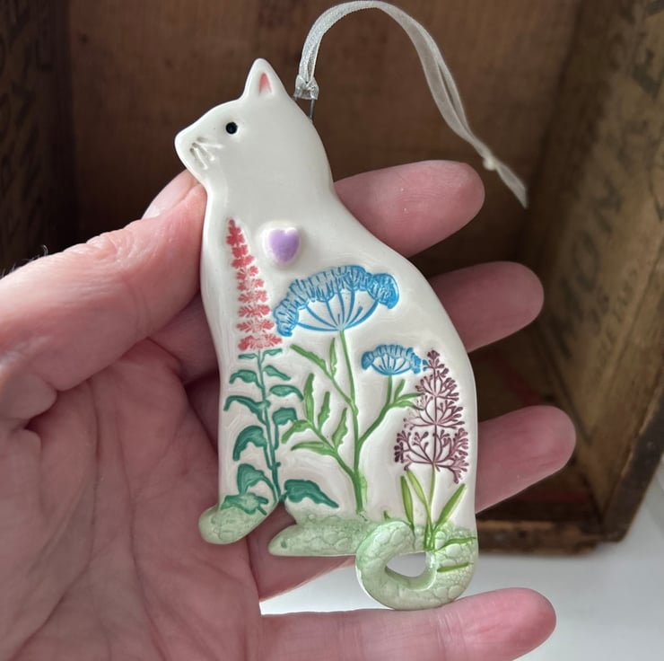 This cute little cat decoration has been made from white earthenware clay and imprinted with a floral design. It has been twice fired in an electric kiln and finished with a clear, glossy glaze.