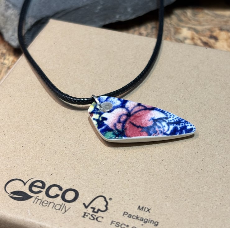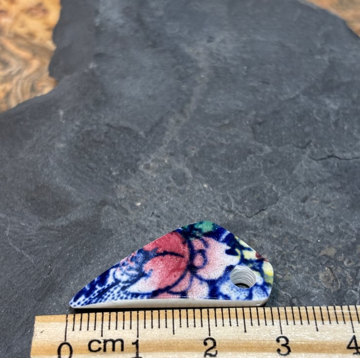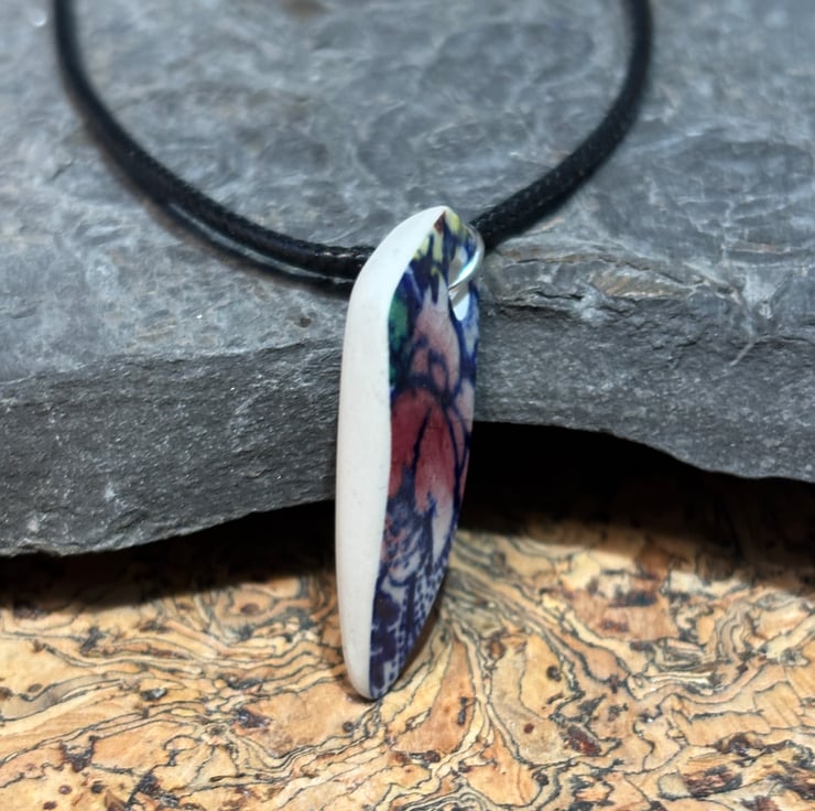 I managed to drill a hole in each and although the glaze is scratched the surface has polished to a lovely shine. This pendant is the more colourful, catching the pink of the flower and a little bit of green. I followed the shape that formed when broken which has created a different style.