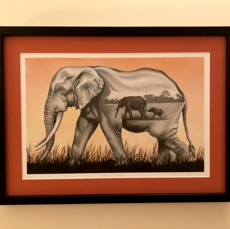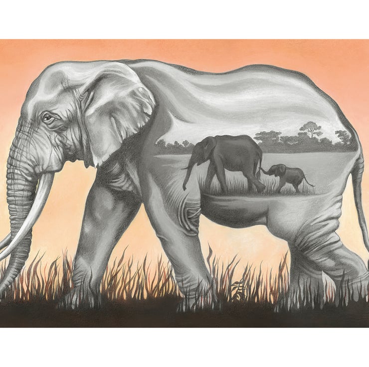 Symbolising many admirable qualities such as strength, power, wisdom, patience and memory, elephants are well known to enjoy close family ties, guided by the Matriarch, leader of the herd. Females remain with their Matriarch led families for their whole life. I chose to use surreal art elements to communicate that sense of love and a deep connectedness with her family. My main visual references for this piece were older female African elephants.