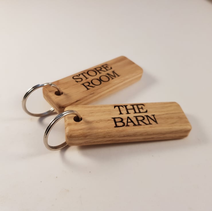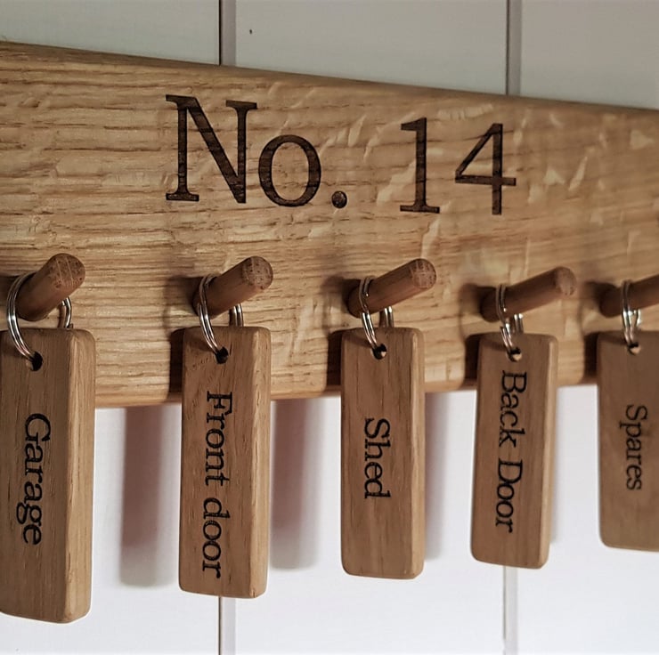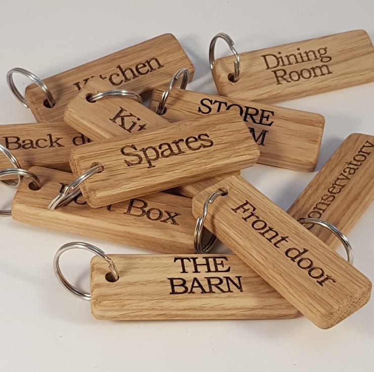 A stylish and personal oak key-ring hand crafted from prime grade oak and finished with a protective top coat. These key-rings can be engraved with numbers or words of your choice to ensure that you never mix up keys again!