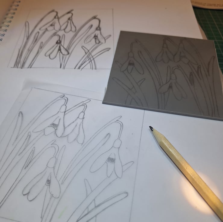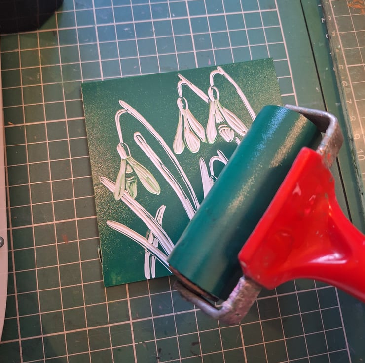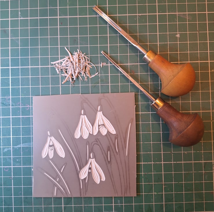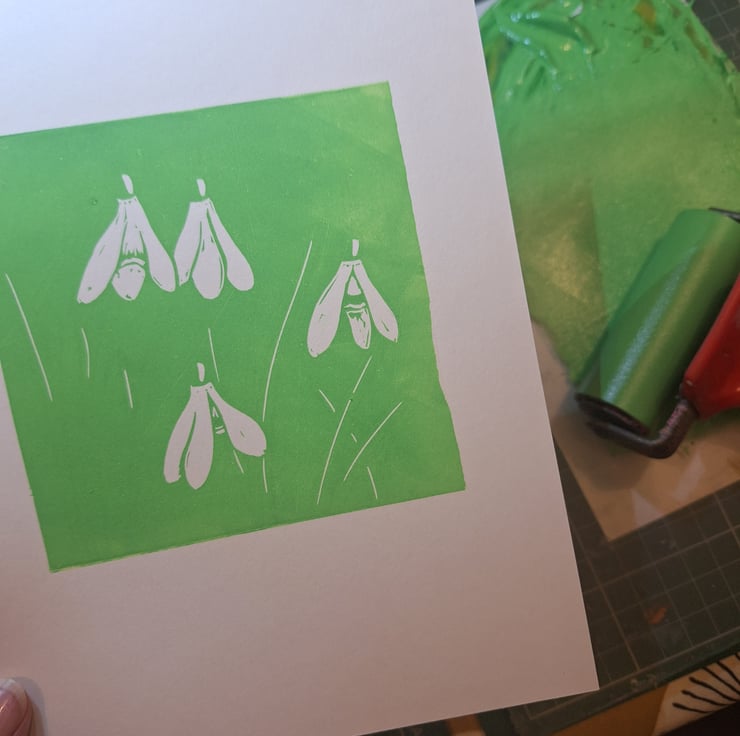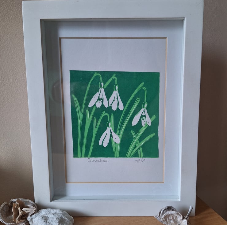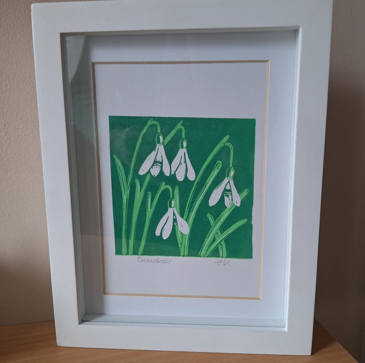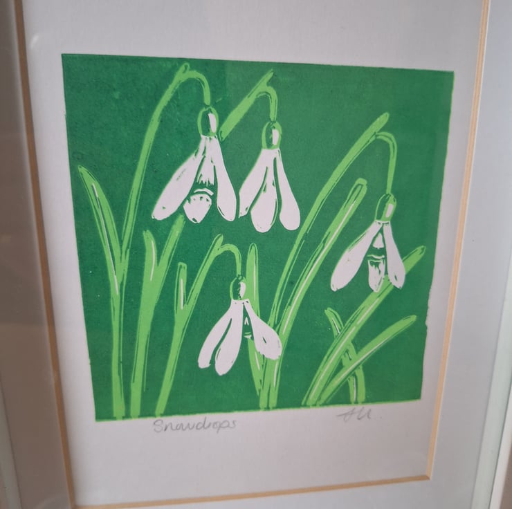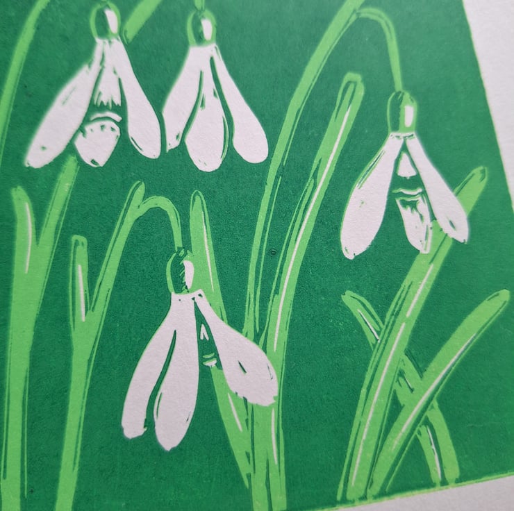 The local countryside is what inspires my prints. These are inspired by snowdrops appearing over the last few weeks. A sign that Speing is on it's way