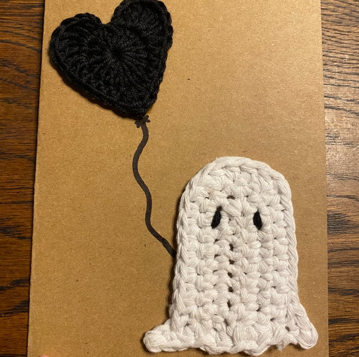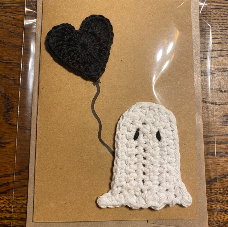 Approximately A6 size, on 280gsm Kraft card. With hand crocheted ghost holding a black heart shaped crochet heart ‘balloon’ on the front.
