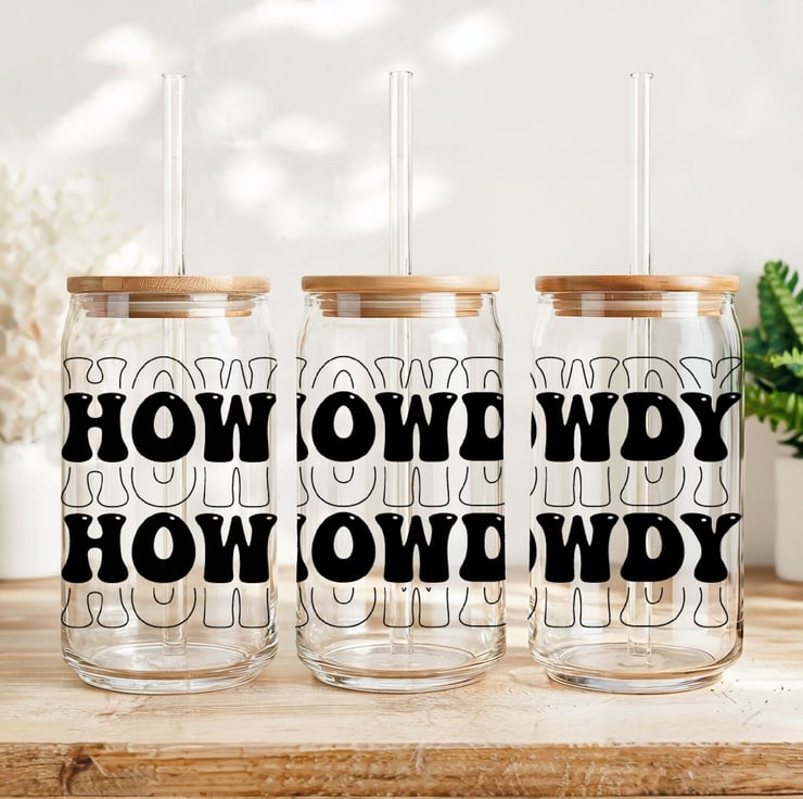 Add a touch of western charm to your daily drinks with this Howdy glass can cup. Featuring bold retro HOWDY lettering, this trendy 16oz iced coffee glass is perfect for coffee lovers, matcha fans, and western aesthetic enthusiasts. Complete with a bamboo lid and straw, it’s stylish, reusable, and perfect for everything from iced coffee to cocktails.