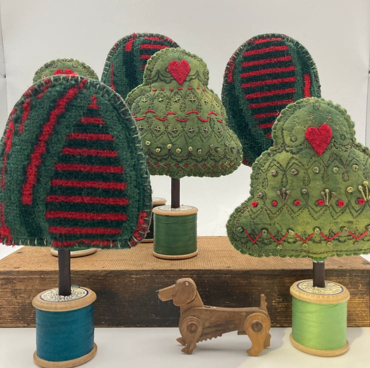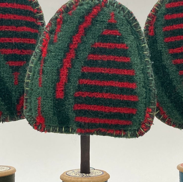 I love finding vintage fabrics that ‘speak tree’ especially if they have a wonderful story or usage in life. Moquette is a fabric everyone knows, but rarely notices so these little trees celebrate days gone bye. They also fit very well with my tree collections as shown in the other photos.