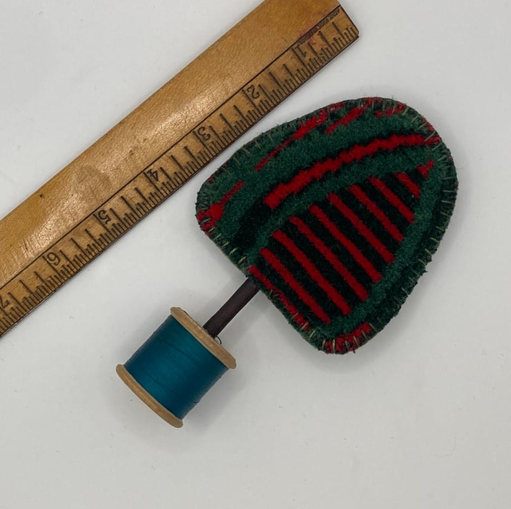 Standing on a vintage wooden cotton reel, lovely teal thread, coordinating beautifully.