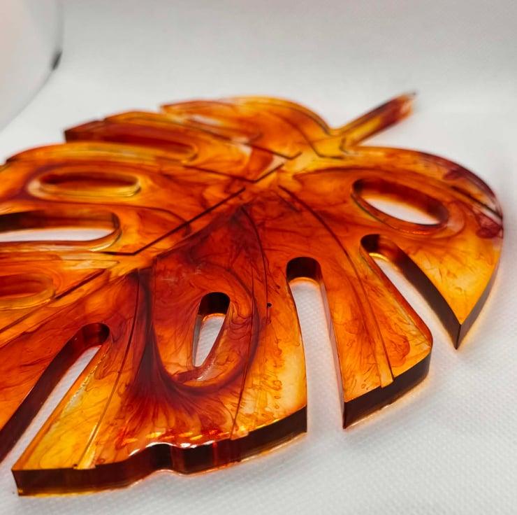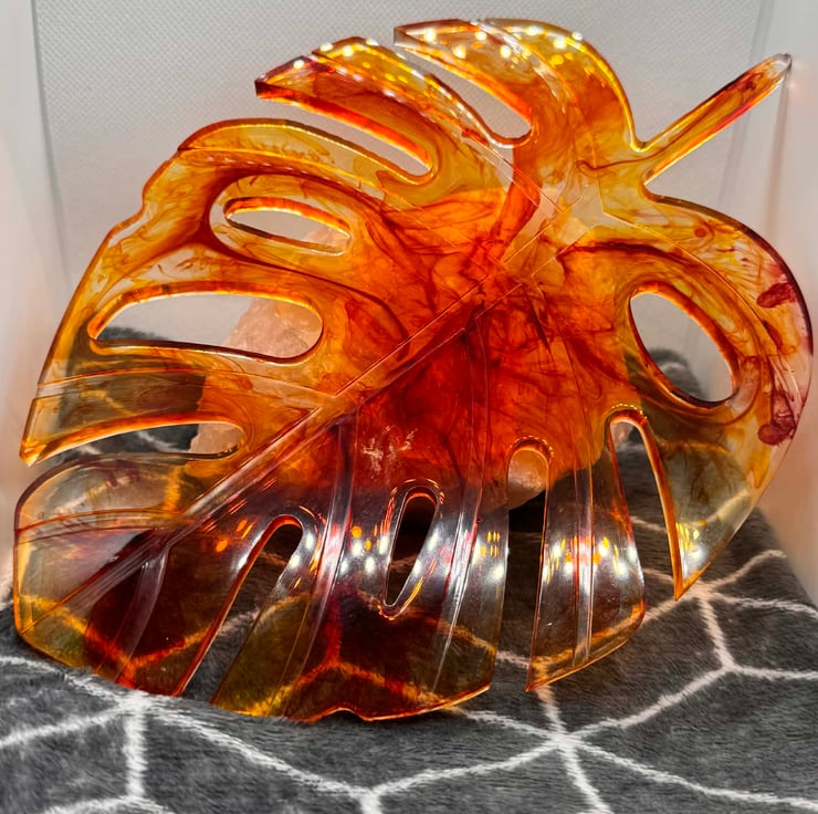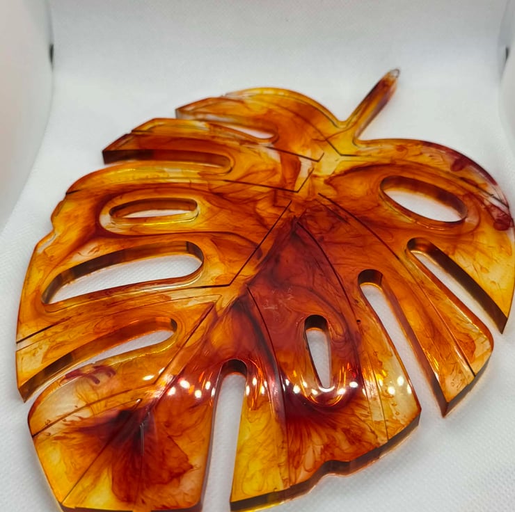 This striking decorative piece features an organic leaf-inspired silhouette crafted in translucent amber resin. Swirls of golden honey, burnt orange, and deep caramel flow through the form, creating a marbled effect that glows beautifully when light passes through it. The cut-out details and fluid edges give the piece a modern, sculptural feel while still echoing natural shapes.