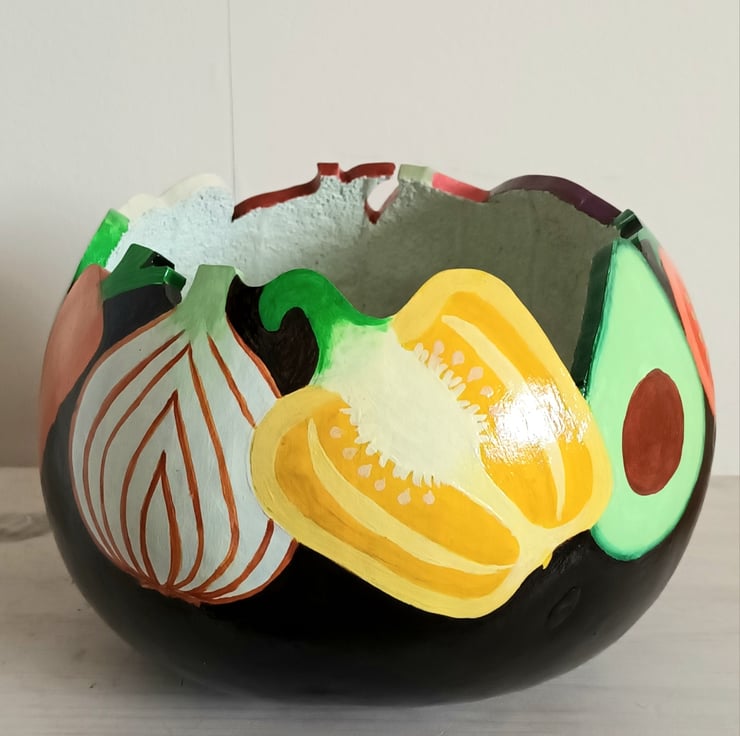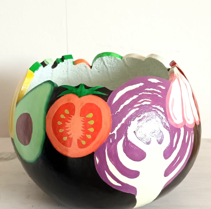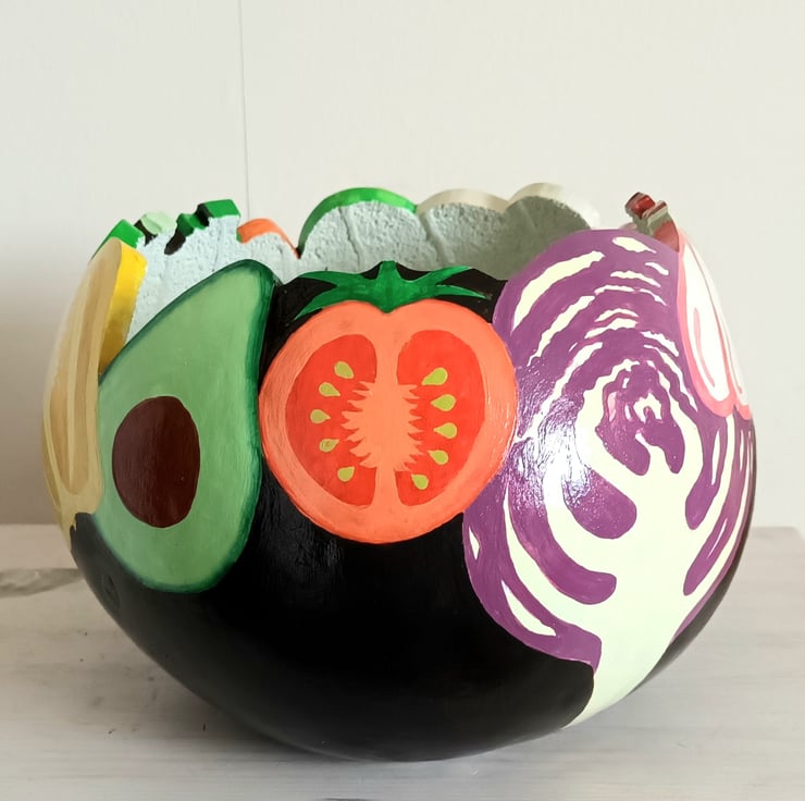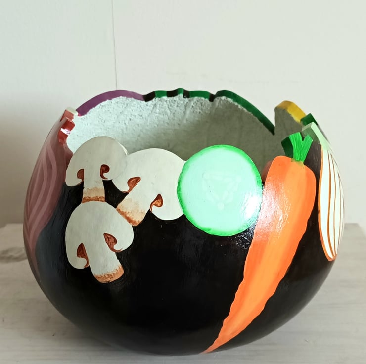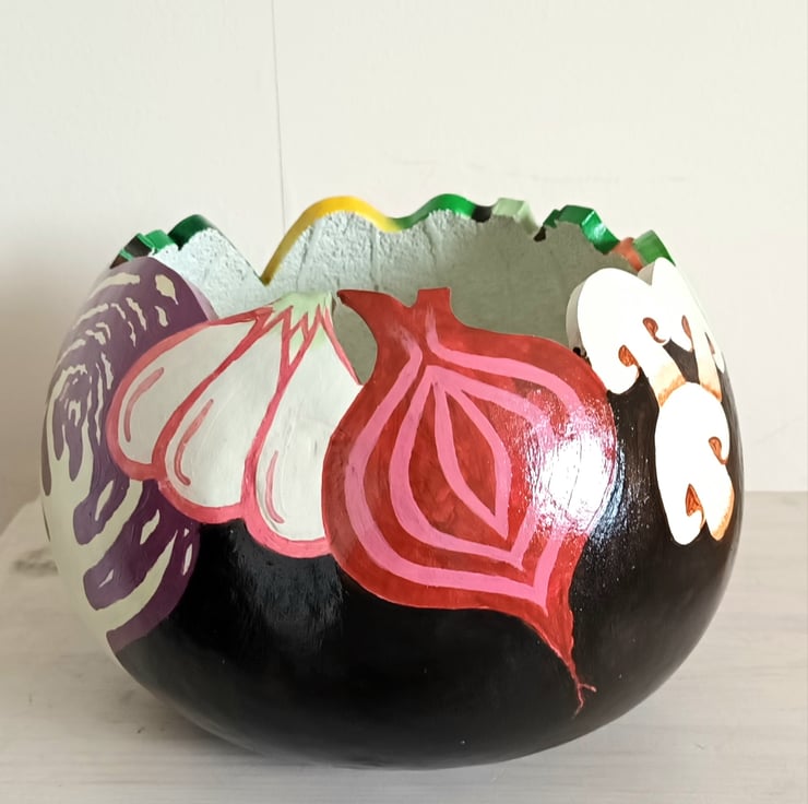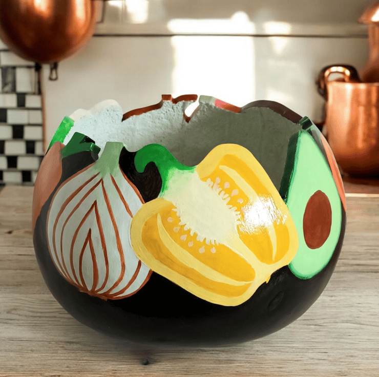 Chunky gourd bowl with handpainted sliced vegetables on a dark brown background.