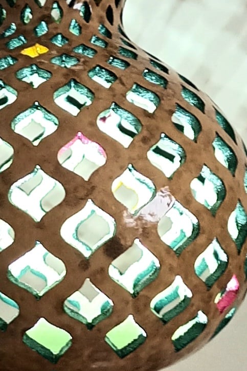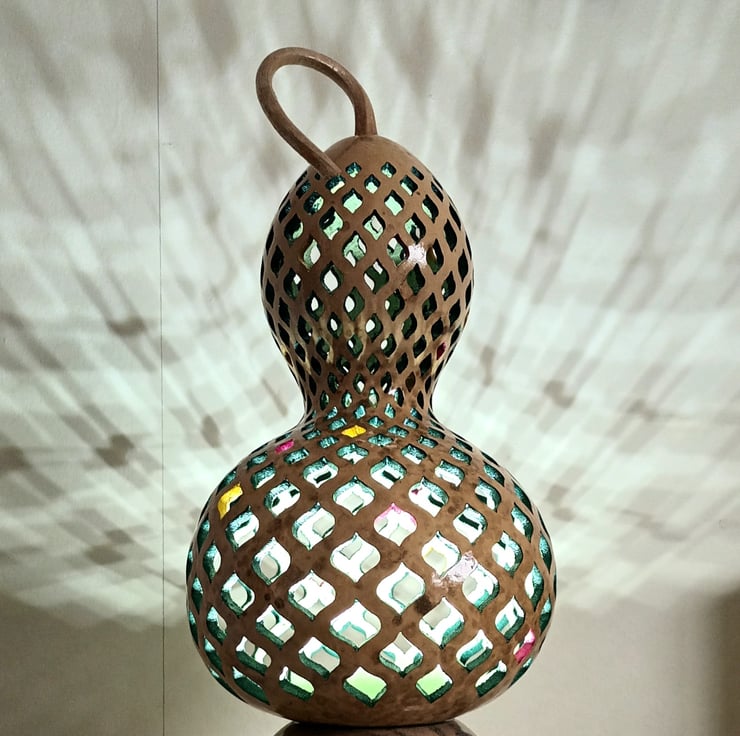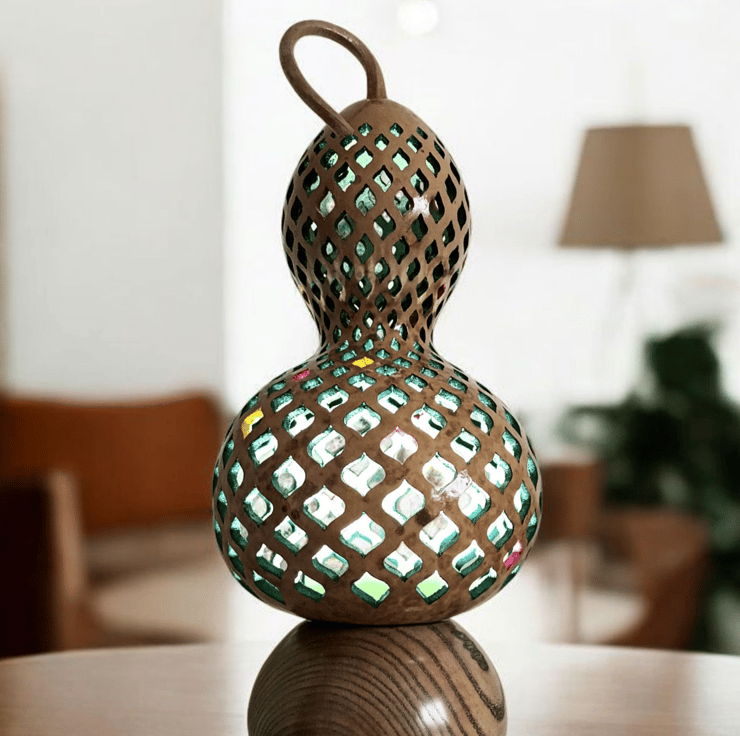 Meticulously carved from a natural bottle gourd, this lamp features a Basketry style pattern, casting amazing shadows around the room.