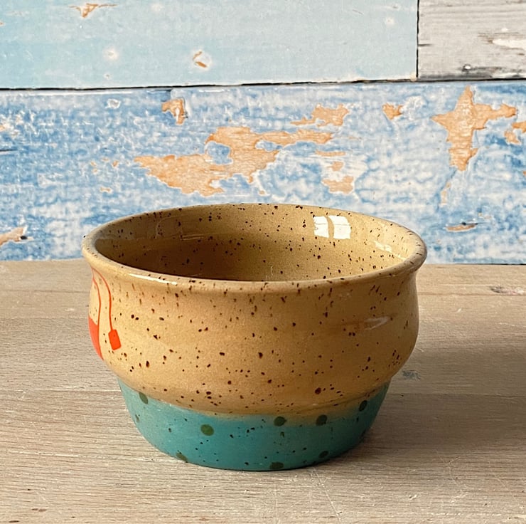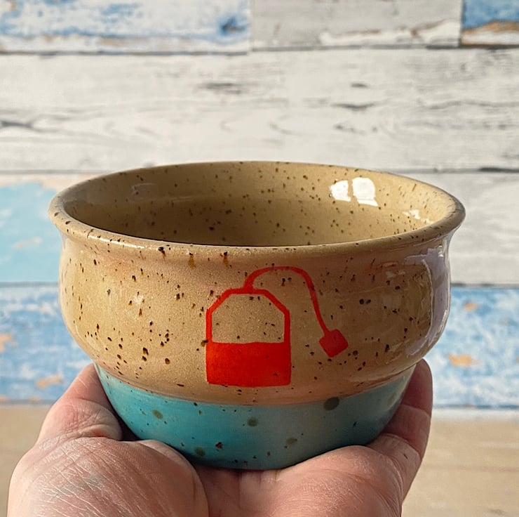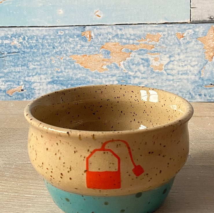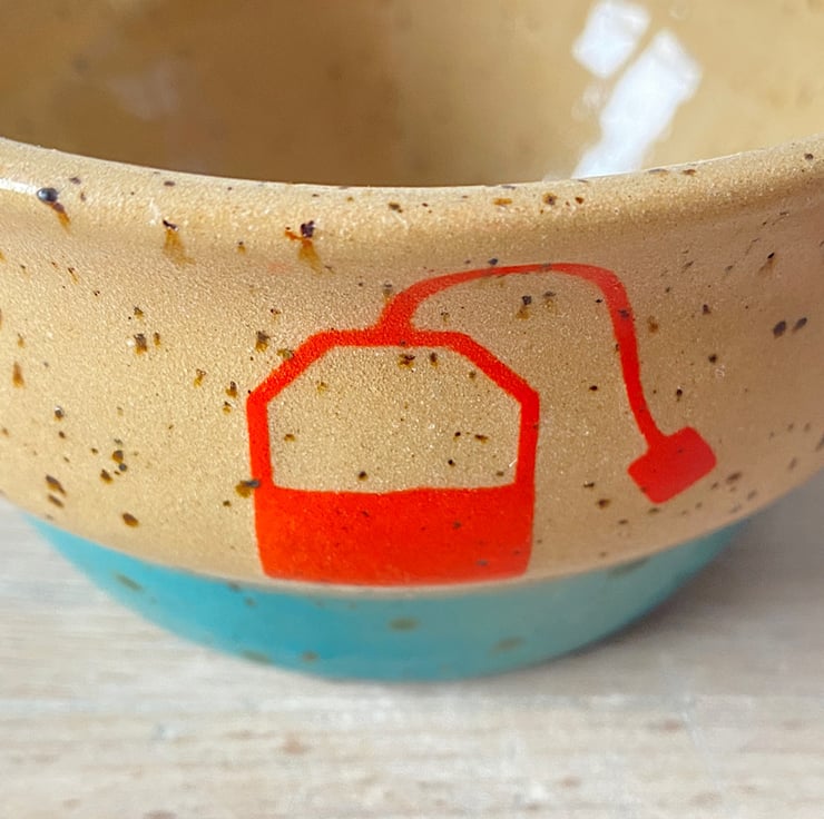 A teal wash base with green polkadots. A hand painted teabag graphic using a bright orange under glaze.