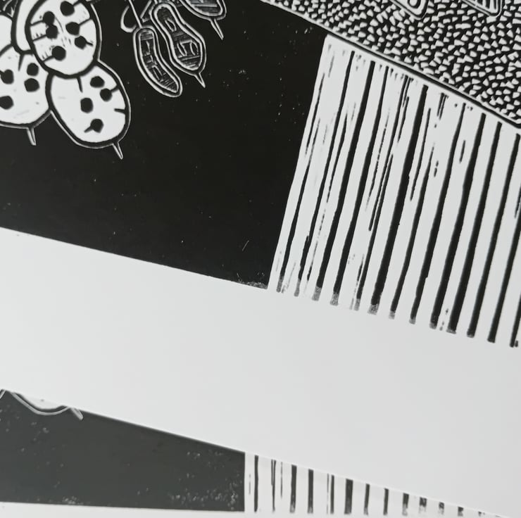 Handprinted by me onto A3 Snowdon heavyweight paper using black Cranfield safe wash ink.