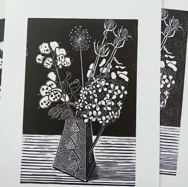 A Limited Edition Black and White Linocut Print of Dried seedheads including Honesty and Hydrangea, displayed in an handmade ceramic jug.