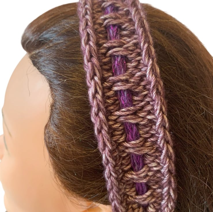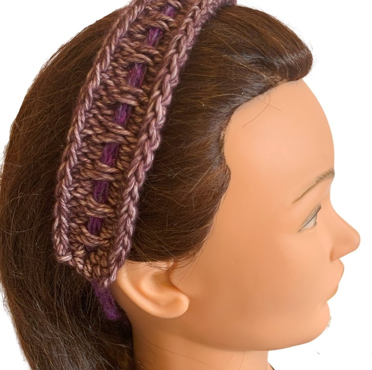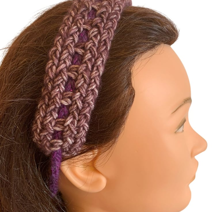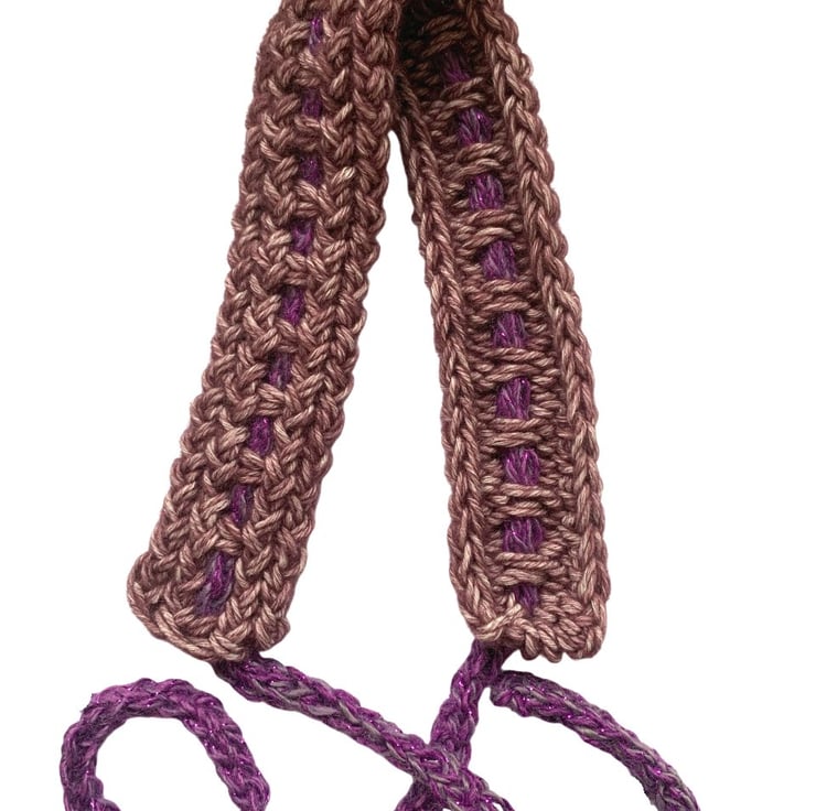 Adjustable, slim style Hair Band that ties to fit. Made from Scheepjes yarn in shades of purple. It's reversible different pattern on both sides. You can also wear this as a knitted choker. It ties at the back to adjust the size.