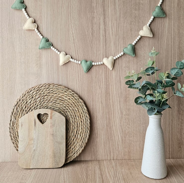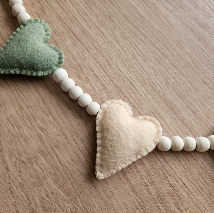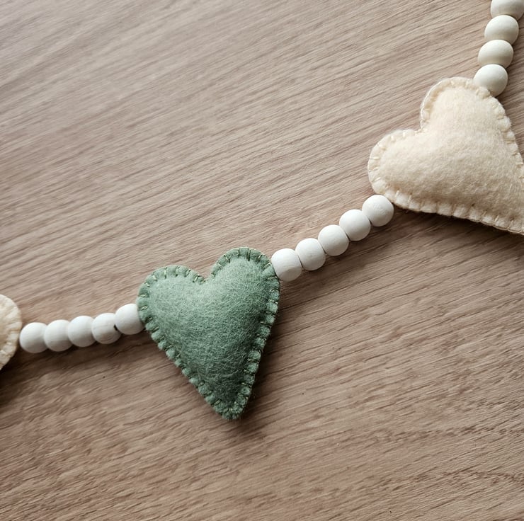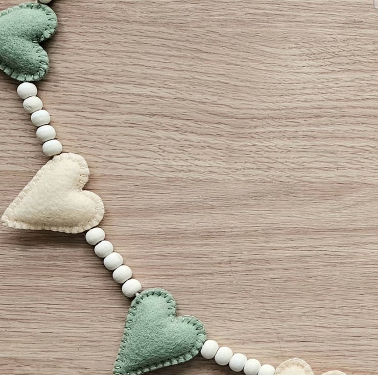 Add a little love to your home decor with this cream and sage green heart garland. Hand stitched from soft felt, it is made up from five green hearts and four cream hearts each measuring 6cm x 5cm. Set apart with five wooden beads.