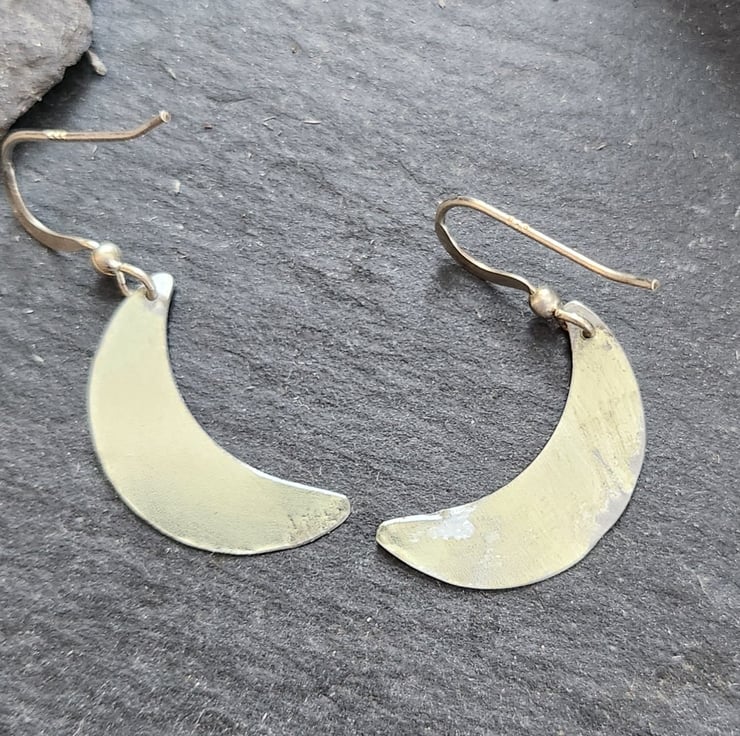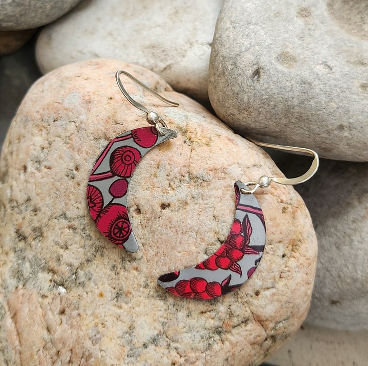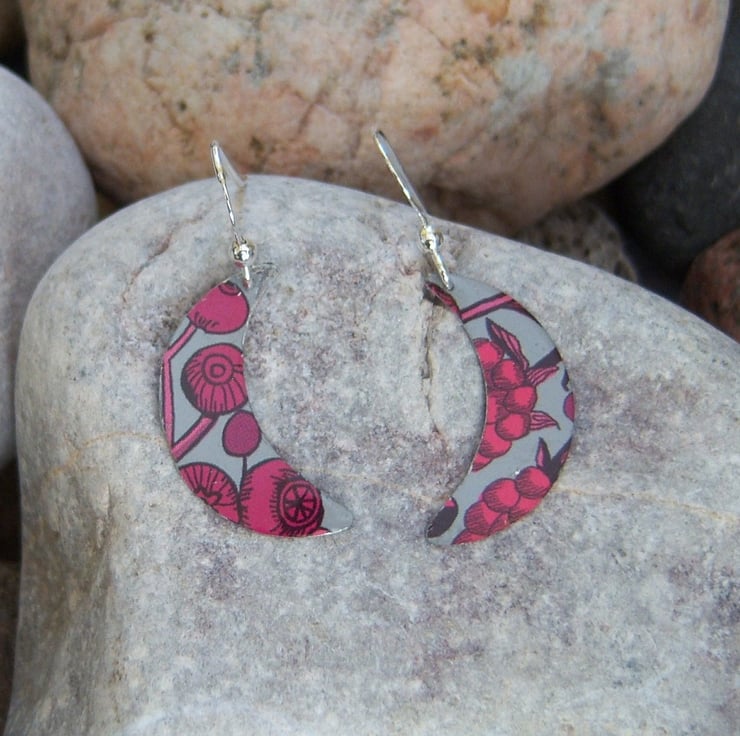 Cut from an old pre-loved biscuit tin. Approximately 2.5cm drop. Moon shape in grey with varying shades of pink to purple leaves and berries. Sterling silver ear wires.