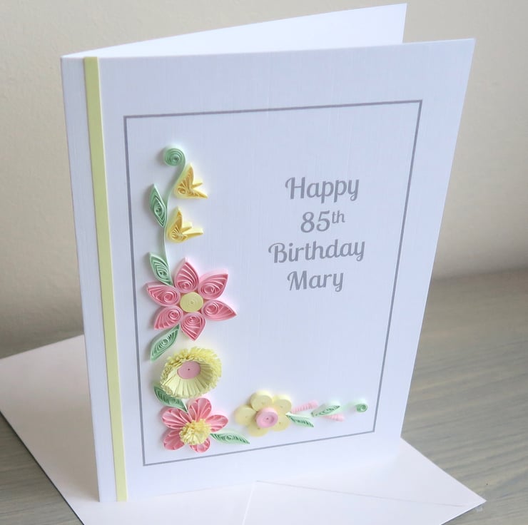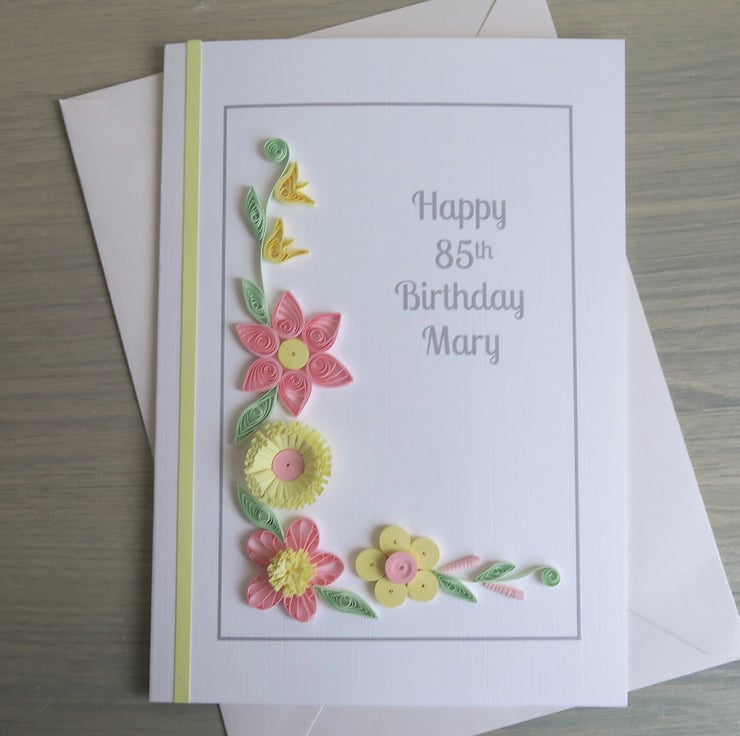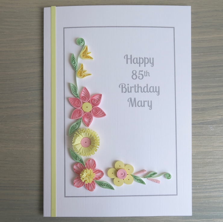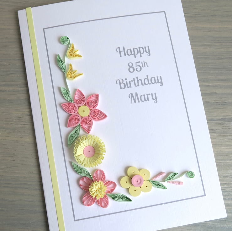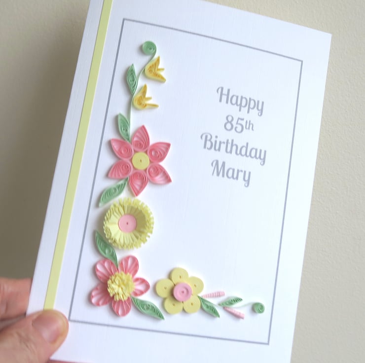 Personalised 85th birthday card, with pink and lemon quilled flowers