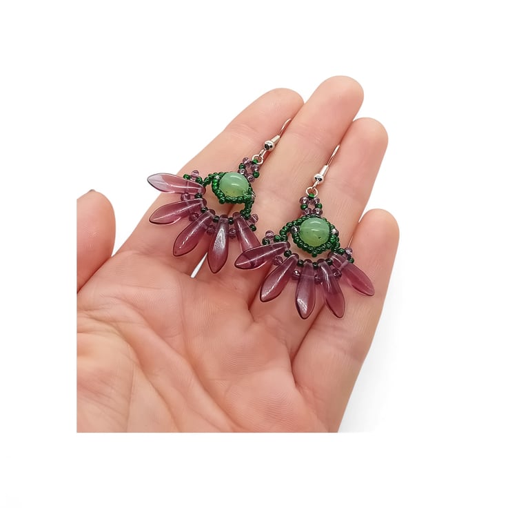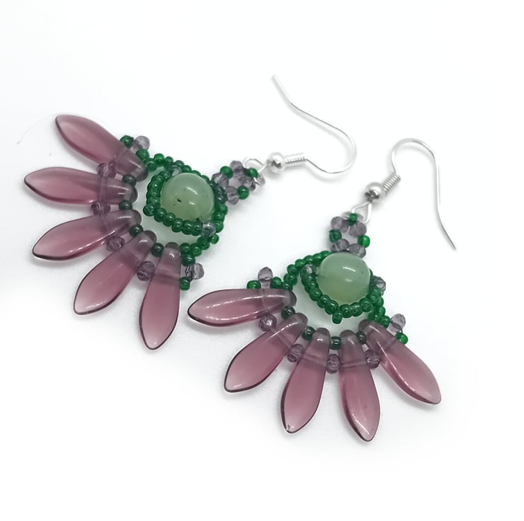 These green and purple dagger bead warrior dangle earrings are lovingly made with pale green focal beads, bottle green seed beads, purple dagger beads and shimmering small faceted gem beads.