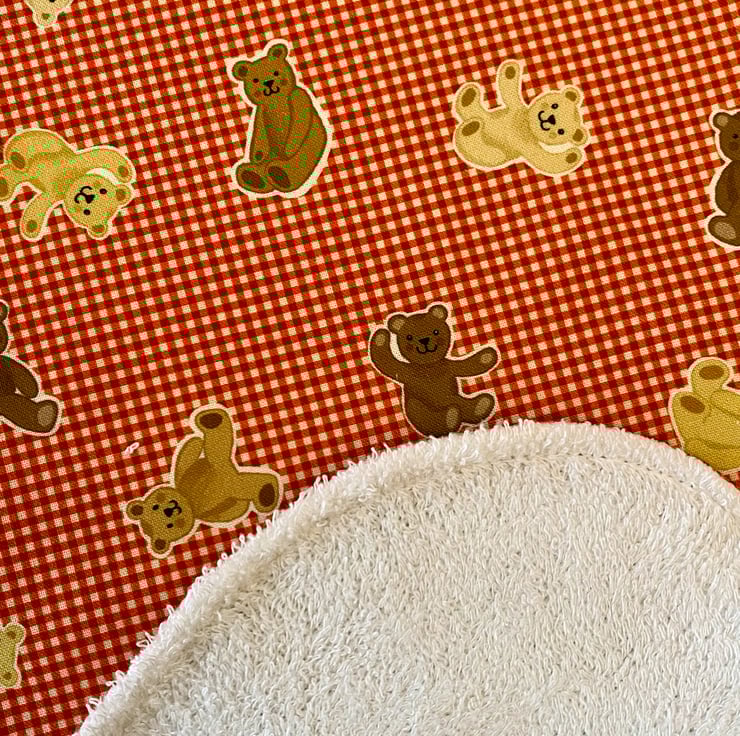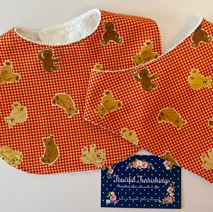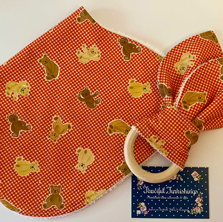 Front fabric is soft 100% cotton and has a beautiful teddy bear design on a lovely red and white gingham background. All four pieces are backed with a beautifully silky bamboo towelling fabric so they’re ultra soft for your babies skin. Bibs sized for approximately 3 months but the fit depends on the size of your baby. Both bibs close with a plastic snap fastener. I have added two so there is some adjustment.