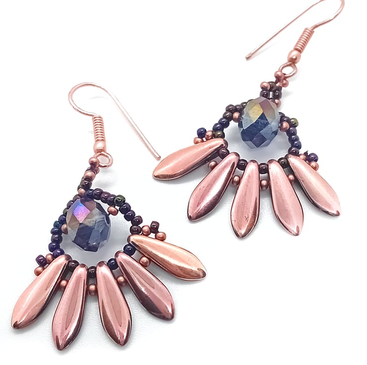 This metallic purple and rose gold dagger bead dangle earrings and necklace set is carefully made with rose gold dagger beads, rose gold seed beads, metallic purple seed beads, rose gold plated chain and findings.