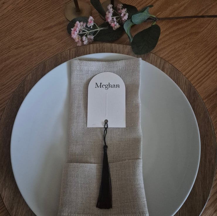 Handcrafted luxury wedding placecards printed on thick 260gsm pearlescent card with a silk tassel, personalised with your guests names