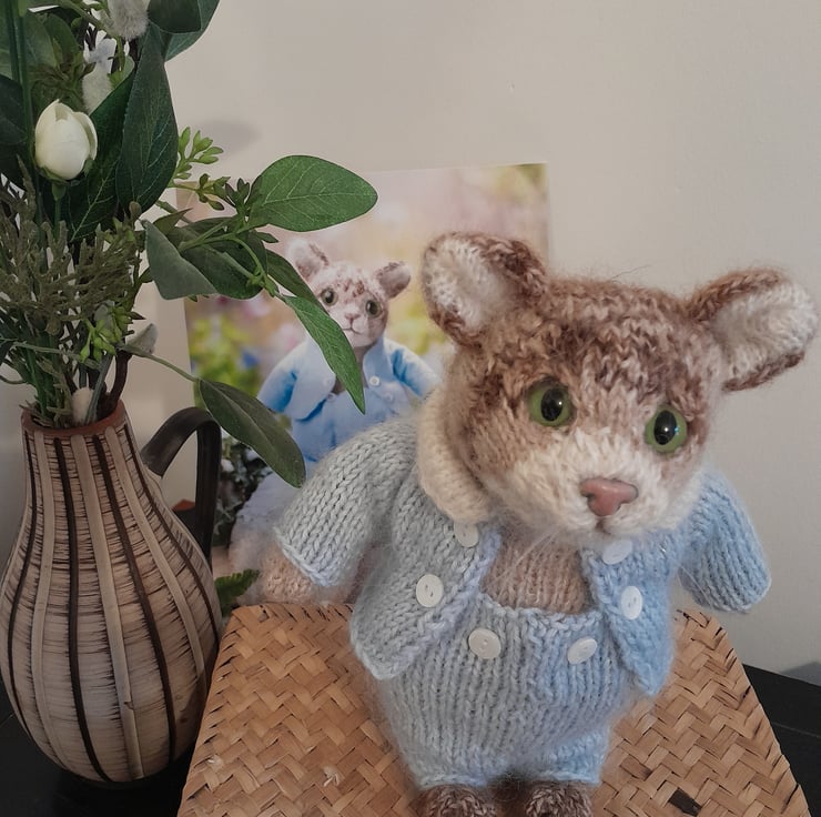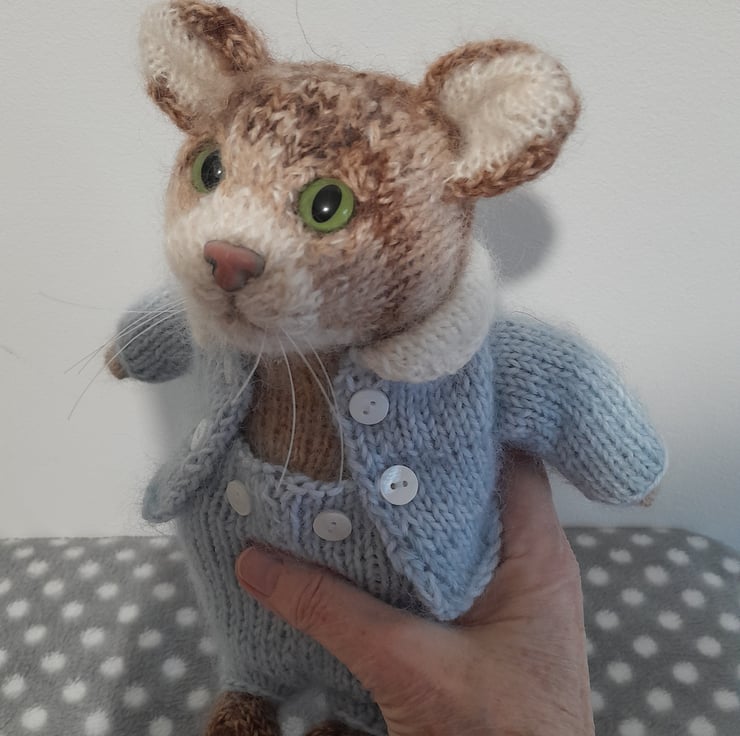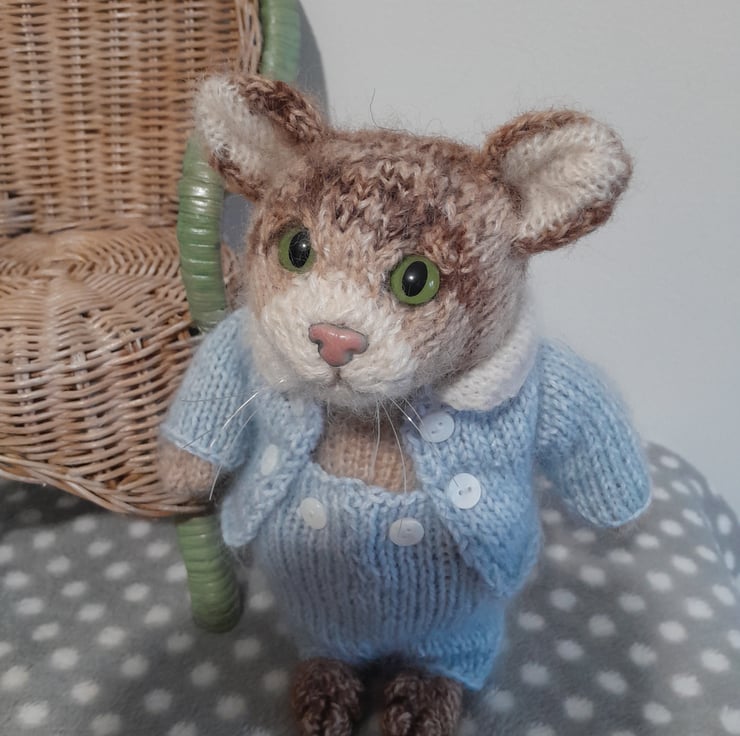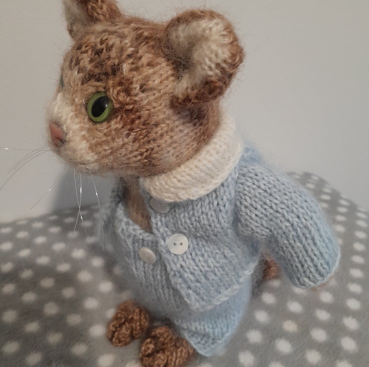Tom Kitten is created from a design by Claire Garland from her book "Knitting Peter Rabbit"