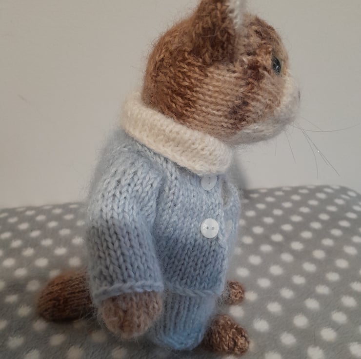 His pretty blue suit is knitted in a soft baby yarn with a strand of mohair and has mother of pearl buttons.